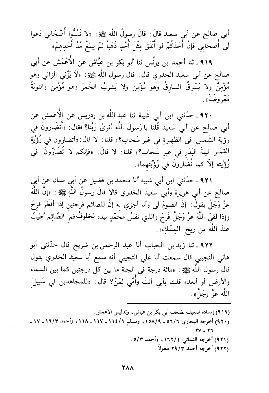 920 - حَدَّثَنِي ابْنُ أَبِي شَيْبَةَ، ثَنَا عَبْدُ اللَّهِ بْنُ إِدْرِيسَ، عَنِ الْأَعْمَشِ، عَنْ أَبِي صَالِحٍ، عَنْ أَبِي سَعِيدٍ: قُلْنَا: يَا رَسُولَ اللَّهِ، أَنَرَى رَبَّنَا؟ فَقَالَ: «§أَتُضَارُونَ فِي رُؤْيَةِ الشَّمْسِ فِي الظَّهِيرَةِ فِي غَيْرِ سَحَابٍ؟» قُلْنَا: لَا قَالَ: «أَتُضَارُونَ فِي رُؤْيَةِ الْقَمَرِ لَيْلَةَ الْبَدْرِ فِي غَيْرِ سَحَابٍ؟» قُلْنَا: لَا، قَالَ: «فَإِنَّكُمْ لَا تُضَارُونَ فِي رُؤْيتِهِ إِلَّا كَمَا تُضَارُونَ فِي رُؤْيَتِهِمَا»