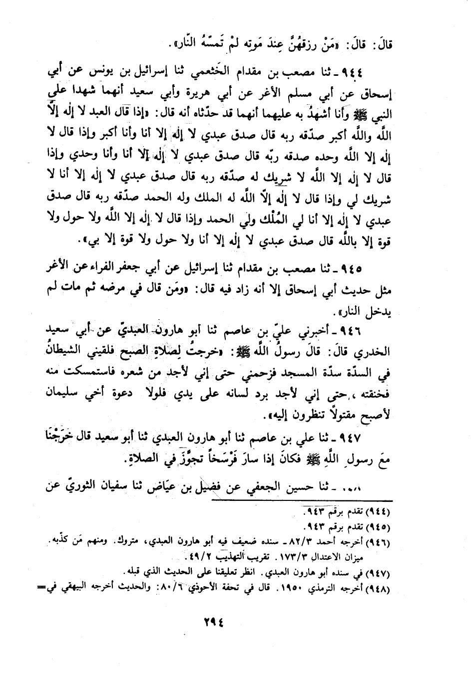 944 - ثنا مُصْعَبُ بْنُ مِقْدَامٍ الْخَثْعَمِيُّ، ثَنَا إِسْرَائِيلُ بْنُ يُونُسَ، عَنْ أَبِي إِسْحَاقَ، عَنْ أَبِي مُسْلِمٍ الْأَغَرِّ، عَنْ أَبِي هُرَيْرَةَ، وَأَبِي سَعِيدٍ: أَنَّهُمَا شَهِدَا عَلَى النَّبِيِّ صَلَّى اللهُ عَلَيْهِ وَسَلَّمَ وَأَنَا أَشْهَدُ بِهِ عَلَيْهِمَا أَنَّهُمَا قَدْ حَدَّثَاهُ أَنَّهُ قَالَ: " §إِذَا قَالَ الْعَبْدُ: لَا إِلَهَ إِلَّا اللَّهُ وَاللَّهُ أَكْبَرُ، صَدَّقَهُ رَبُّهُ، قَالَ: صَدَقَ عَبْدِي لَا إِلَهَ إِلَّا أَنَا وَأَنَا أَكْبَرُ، وَإِذَا قَالَ: لَا إِلَهَ إِلَّا اللَّهُ وَحْدَهُ صَدَّقَهُ رَبُّهُ قَالَ: صَدَقَ عَبْدِي لَا إِلَهَ إِلَّا أَنَا وَأَنَا وَحْدِي، وَإِذَا قَالَ: لَا إِلَهَ إِلَّا اللَّهُ لَا شَرِيكَ لَهُ، صَدَّقَهُ رَبُّهُ، قَالَ: صَدَقَ عَبْدِي لَا إِلَهَ إِلَّا أَنَا لَا شَرِيكَ لِي، وَإِذَا قَالَ: لَا إِلَهَ إِلَّا اللَّهُ لَهُ الْمُلْكُ وَلَهُ الْحَمْدُ، صَدَّقَهُ رَبُّهُ قَالَ: صَدَقَ عَبْدِي، لَا إِلَهَ إِلَّا أَنَا لِيَ الْمُلْكُ وَلِيَ الْحَمْدُ، وَإِذَا قَالَ: لَا إِلَهَ إِلَّا اللَّهُ وَلَا حَوْلَ وَلَا قُوَّةَ إِلَّا بِاللَّهِ، قَالَ: صَدَقَ عَبْدِي لَا إِلَهَ إِلَّا أَنَا وَلَا حَوْلَ وَلَا قُوَّةَ إِلَّا بِي "،