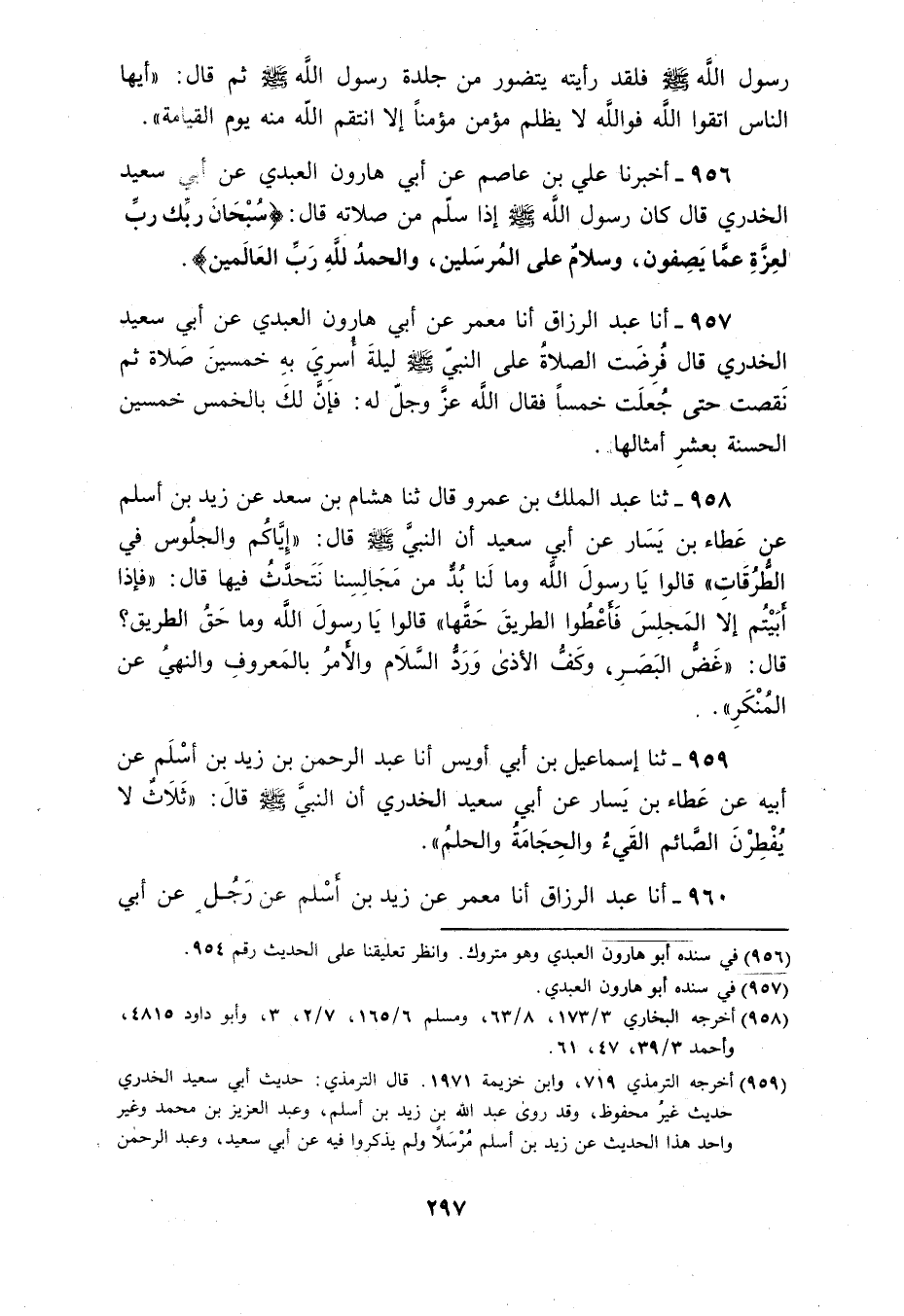958 - ثنا عَبْدُ الْمَلِكِ بْنُ عَمْرٍو قَالَ: ثَنَا هِشَامُ بْنُ سَعْدٍ، عَنْ زَيْدِ بْنِ أَسْلَمَ، عَنْ عَطَاءِ بْنِ يَسَارٍ، عَنْ أَبِي سَعِيدٍ، أَنَّ النَّبِيَّ صَلَّى اللهُ عَلَيْهِ وَسَلَّمَ قَالَ: «§إِيَّاكُمْ وَالْجُلُوسَ فِي الطُّرُقَاتِ» ، قَالُوا: يَا رَسُولَ اللَّهِ، وَمَا لَنَا بُدٌّ مِنْ مَجَالِسِنَا نَتَحَدَّثُ فِيهَا، قَالَ: فَإِذَا أَبَيْتُمْ إِلَّا الْمَجْلِسَ فَأَعْطُوا الطَّرِيقَ حَقَّهَا، قَالُوا: يَا رَسُولَ اللَّهِ، وَمَا حَقُّ الطَّرِيقِ؟ قَالَ: «غَضُّ الْبَصَرِ، وَكَفُّ الْأَذَى، وَرَدُّ السَّلَامِ، وَالْأَمَرُ بِالْمَعْرُوفِ وَالنَّهْيُ عَنِ الْمُنْكَرِ»