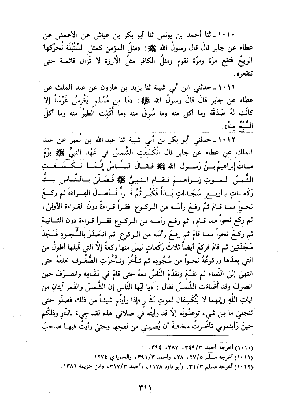 1012 - حَدَّثَنِي أَبُو بَكْرِ بْنُ أَبِي شَيْبَةَ، ثَنَا عَبْدُ اللَّهِ بْنُ نُمَيْرٍ، عَنْ عَبْدِ الْمَلِكِ، عَنْ عَطَاءٍ، عَنْ جَابِرٍ قَالَ: " انْكَسَفَتِ الشَّمْسُ فِي عَهْدِ النَّبِيِّ صَلَّى اللهُ عَلَيْهِ وَسَلَّمَ يَوْمَ مَاتَ إِبْرَاهِيمُ ابْنُ رَسُولِ اللَّهِ صَلَّى اللهُ عَلَيْهِ وَسَلَّمَ، فَقَالَ النَّاسُ: إِنَّمَا انْكَسَفَتِ الشَّمْسُ لِمَوْتِ إِبْرَاهِيمَ، فَقَامَ النَّبِيُّ صَلَّى اللهُ عَلَيْهِ وَسَلَّمَ، فَصَلَّى بِالنَّاسِ سِتَّ رَكَعَاتٍ بِأَرْبَعِ سَجَدَاتٍ بَدَأَ فَكَبَّرَ، ثُمَّ قَرَأَ فَأَطَالَ الْقِرَاءَةَ، ثُمَّ رَكَعَ نَحْوًا مِمَّا قَامَ، ثُمَّ رَفَعَ رَأْسَهُ مِنَ الرُّكُوعِ فَقَرَأَ قِرَاءةً دُونَ الْقِرَاءَةِ الْأُولَى، ثُمَّ رَكَعَ نَحْوًا مِمَّا قَامَ، ثُمَّ رَفَعَ رَأْسَهُ مِنَ الرُّكُوعِ، فَقَرَأَ قِرَاءةً دُونَ الثَّانِيَةِ ثُمَّ رَكَعَ نَحْوًا مِمَّا قَامَ , ثُمَّ رَفَعَ رَأْسَهُ مِنَ الرُّكُوع، ثُمَّ انْحَدَرَ بِالسُّجُودِ فَسَجَدَ سَجْدَتَيْنِ، ثُمَّ قَامَ فَرَكَعَ أَيْضًا ثَلَاثَ رَكَعَاتٍ لَيْسَ مِنْهَا رَكْعَةٌ إِلَّا الَّتِي قَبْلَهَا أَطْوَلُ مِنَ الَّتِي بَعْدَهَا، وَرُكُوعُهُ نَحْوًا مِنْ سُجُودِهِ، ثُمَّ تَأَخَّرَ وَتَأَخَّرَتِ الصُّفُوفُ خَلْفَهُ حَتَّى انْتَهَى إِلَى النِّسَاءِ، ثُمَّ تَقَدَّمَ وَتَقَدَّمَ النَّاسُ مَعَهُ حَتَّى قَامَ فِي مَقَامِهِ وَانْصَرَفَ حِينَ انْصَرَفَ وَقَدْ أَضَأَتِ الشَّمْسُ، فَقَالَ: " يَا أَيُّهَا النَّاسُ، إِنَّ §الشَّمْسَ وَالْقَمَرَ آيَتَانِ مِنْ آيَاتِ اللَّهِ، وَإِنَّهُمَا لَا يَنْكَسِفَانِ لِمَوْتِ بَشَرٍ، فَإِذَا رَأَيْتُمْ شَيْئًا مِنْ ذَلِكَ فَصَلُّوا حَتَّى تَنْجَلِيَ، مَا مِنْ شَيْءٍ تُوَعَدُونَهُ إِلَّا قَدْ رَأَيْتُهُ فِي صَلَاتِي هَذِهِ، لَقَدْ جِيءَ بِالنَّارِ وَذَلِكُمْ حِينَ رَأَيْتُمُونِي تَأَخَّرْتُ مَخَافَةَ أَنْ يُصِيبَنِي مِنْ لَفْحِهَا وَحَتَّى رَأَيْتُ فِيهَا صَاحِبَ الْمِحْجَنِ يَجُرُّ قُصْبَهُ فِي النَّارِ، كَانَ يَسْرِقُ مَتَاعَ الْحَاجِّ بِمِحْجَنِهِ، فَإِنْ فُطِنَ لَهُ قَالَ: إِنَّمَا تَعَلَّقَ بِمِحْجَنِي، وَإِنْ غُفِلَ عَنْهُ ذُهِبَ بِهِ، وَحَتَّى رَأَيْتُ فِيهَا صَاحِبَةَ الْهِرَّةِ الَّتِي رَبَطَتْهَا فَلَمْ تُطْعِمْهَا وَلَمْ تَدَعْهَا تَأْكُلُ مِنْ خَشَاشِ الْأَرْضِ حَتَّى مَاتَتْ جُوعًا، ثُمَّ جِيءَ بِالْجَنَّةِ، وَذَلِكُمْ حِينَ رَأَيْتُمُونِي تَقَدَّمْتُ حَتَّى قُمْتُ فِي مَقَامِي وَلَقَدْ مَدَدْتُ يَدِي وَأَنَا أُرِيدُ أَنْ أَتَنَاوَلَ مِنْ ثَمَرِهَا لِتَنْظُرُوا إِلَيْهِ، ثُمَّ بَدَا لِي أَنْ لَا أَفْعَلَ، فَمَا مِنْ شَيْءٍ تُوَعَدُونَهُ إِلَّا قَدْ رَأَيْتُهُ فِي صَلَاتِي هَذِهِ "