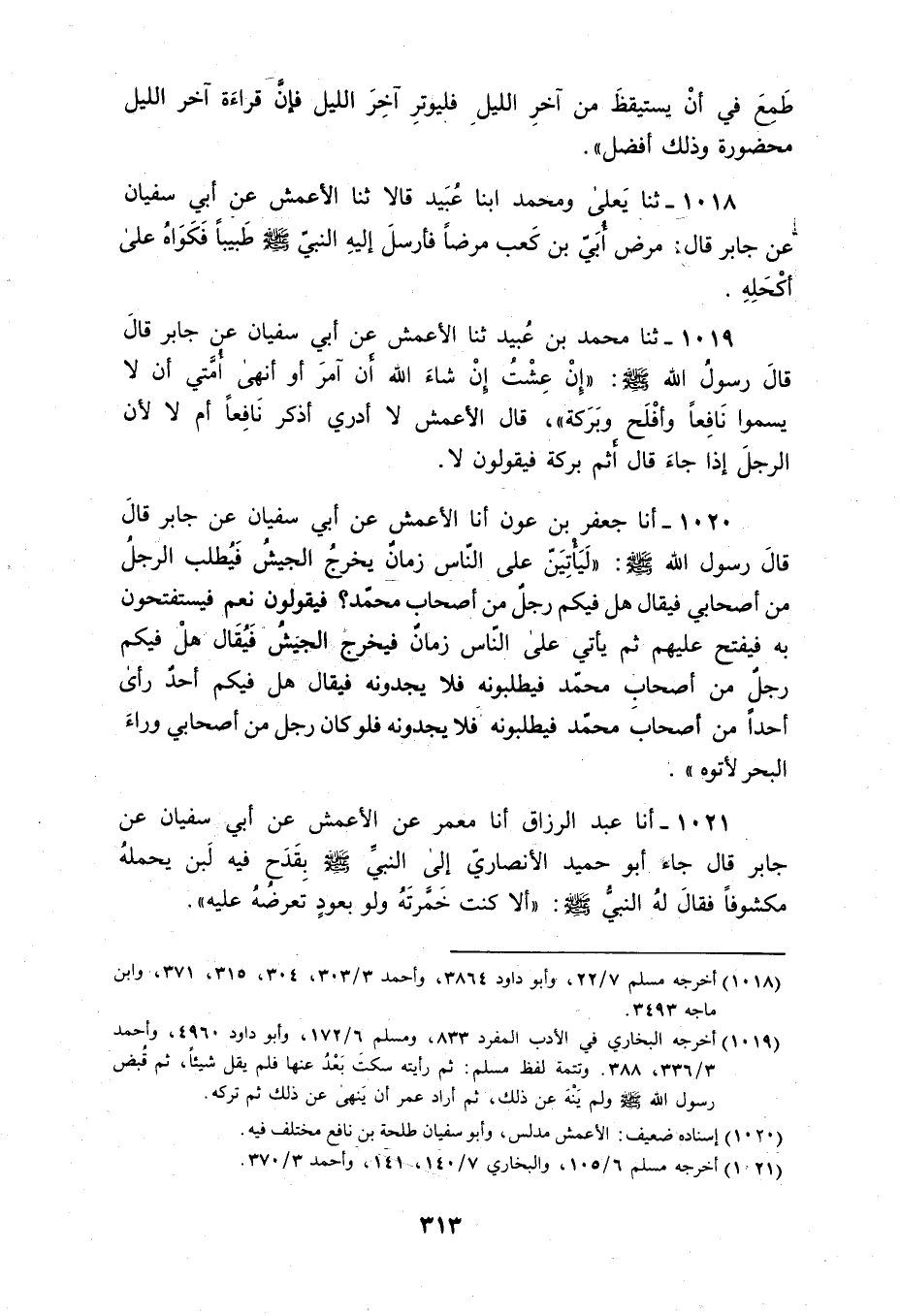 1019 - ثنا مُحَمَّدُ بْنُ عُبَيْدٍ، ثَنَا الْأَعْمَشُ، عَنْ أَبِي سُفْيَانَ، عَنْ جَابِرٍ قَالَ: قَالَ رَسُولُ اللَّهِ صَلَّى اللهُ عَلَيْهِ وَسَلَّمَ: «إِنْ §عِشْتُ إِنْ شَاءَ اللَّهُ أَنْ آمُرَ أَوْ أَنْهَى أُمَّتِي أَنْ لَا يُسَمُّوا نَافِعًا وَأفْلَحَ وَبَرَكَةَ» ، قَالَ الْأَعْمَشُ: " لَا أَدْرِي أَذَكَرَ نَافِعًا أَمْ لَا؛ لِأَنَّ الرَّجُلَ إِذَا جَاءَ قَالَ: أَثَمَّ بَرَكَةٌ؟ فَيَقُولُونَ: لَا "