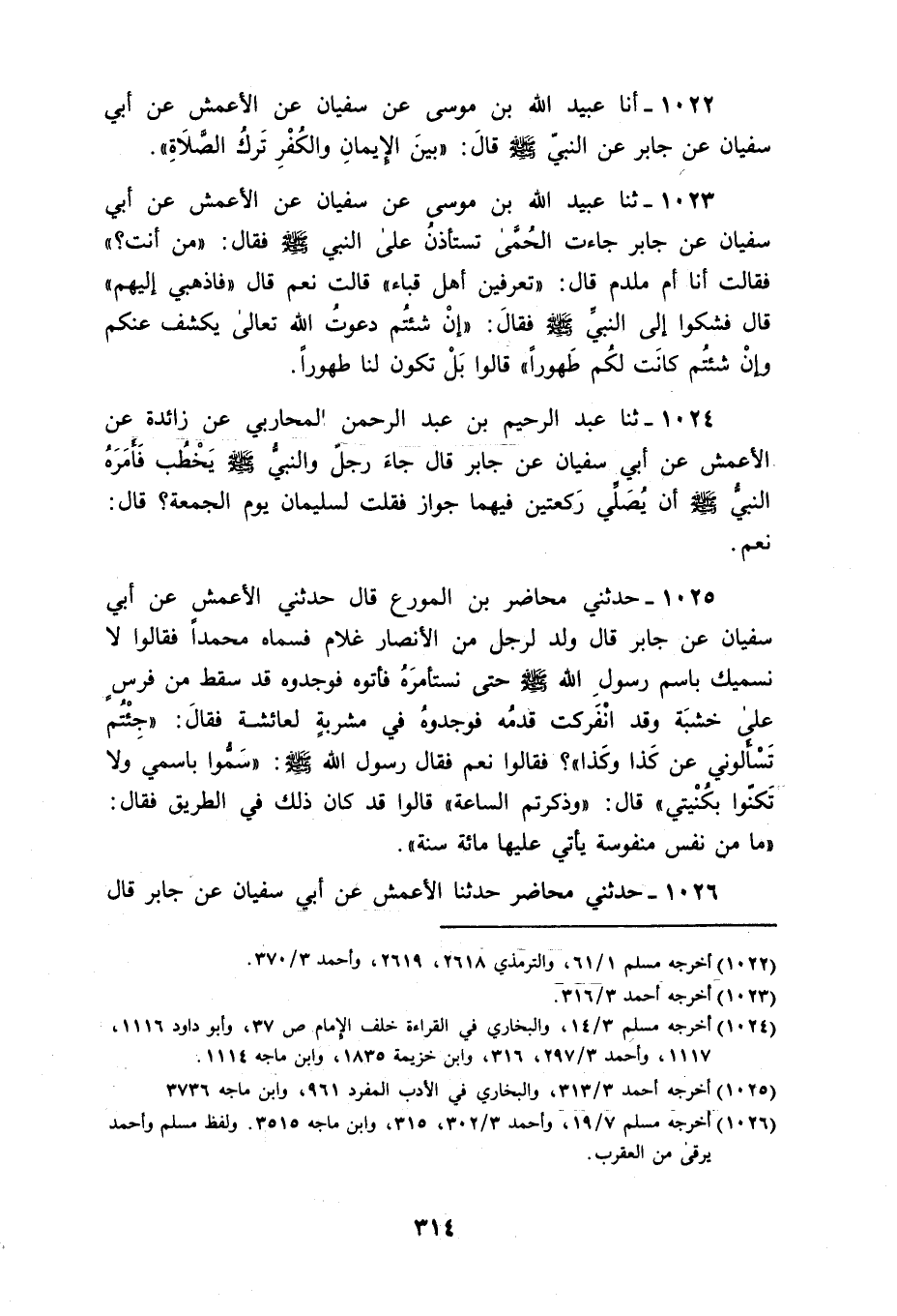 1022 - أنا عُبَيْدُ اللَّهِ بْنُ مُوسَى، عَنْ سُفْيَانَ، عَنِ الْأَعْمَشِ، عَنْ أَبِي سُفْيَانَ، عَنْ جَابِرٍ، عَنِ النَّبِيِّ صَلَّى اللهُ عَلَيْهِ وَسَلَّمَ قَالَ: «§بَيْنَ الْإِيمَانِ وَالْكُفْرِ تَرْكُ الصَّلَاةِ»