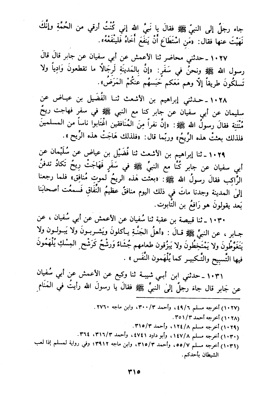1030 - ثنا قَبِيصَةُ بْنُ عُقْبَةَ، ثَنَا سُفْيَانُ، عَنِ الْأَعْمَشِ، عَنْ أَبِي سُفْيَانَ، عَنْ جَابِرٍ، عَنِ النَّبِيِّ صَلَّى اللهُ عَلَيْهِ وَسَلَّمَ، قَالَ: «§أَهْلُ الْجَنَّةِ يَأْكُلُونَ وَيَشْرَبُونَ وَلَا يَبُولُونَ وَلَا يَتَغَوَّطُونَ، وَلَا يَمْتَخِطُونَ، وَلَا يَبْزُقُونَ، طَعَامُهُمْ جُشَاءٌ، وَرَشْحٌ كَرَشْحِ الْمِسْكِ، يُلْهَمُونَ فِيهَا التَّسْبِيحَ وَالتَّكْبِيرَ كَمَا يُلْهَمُونَ النَّفَسَ»