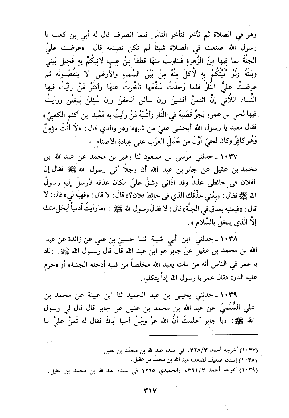 1039 - حَدَّثَنِي يَحْيَى بْنُ عَبْدِ الْحَمِيدِ، ثَنَا ابْنُ عُيَيْنَةَ، عَنْ مُحَمَّدِ بْنِ عَلِيٍّ السُّلَمِيِّ، عَنْ عَبْدِ اللَّهِ بْنِ مُحَمَّدِ بْنِ عَقِيلٍ، عَنْ جَابِرٍ قَالَ: قَالَ لِي رَسُولُ اللَّهِ صَلَّى اللهُ عَلَيْهِ وَسَلَّمَ: " يَا جَابِرُ، §أَعَلِمْتَ أَنَّ اللَّهَ عَزَّ وَجَلَّ أَحْيَا أَبَاكَ، فَقَالَ لَهُ: تَمَنَّ عَلَيَّ مَا شِئْتَ، فَقَالَ: أُرَدُّ إِلَى الدُّنْيَا فَأُقْتَلُ مَرَّةً أُخْرَى، فَقَالَ: إِنِّي قَضَيْتُ أَنَّهُمْ لَا يَرْجِعُونَ "