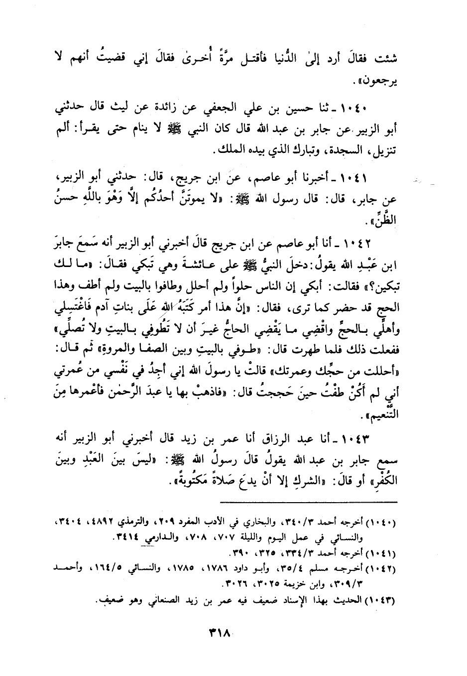 1041 - أَخْبَرَنَا أَبُو عَاصِمٍ، عَنِ ابْنِ جُرَيْجٍ قَالَ: حَدَّثَنِي أَبُو الزُّبَيْرِ، عَنْ جَابِرٍ قَالَ: قَالَ رَسُولُ اللَّهِ صَلَّى اللهُ عَلَيْهِ وَسَلَّمَ: «§لَا يَمُوتَنَّ أَحَدُكُمْ إِلَّا وَهُوَ بِاللَّهِ حَسَنُ الظَّنِّ»