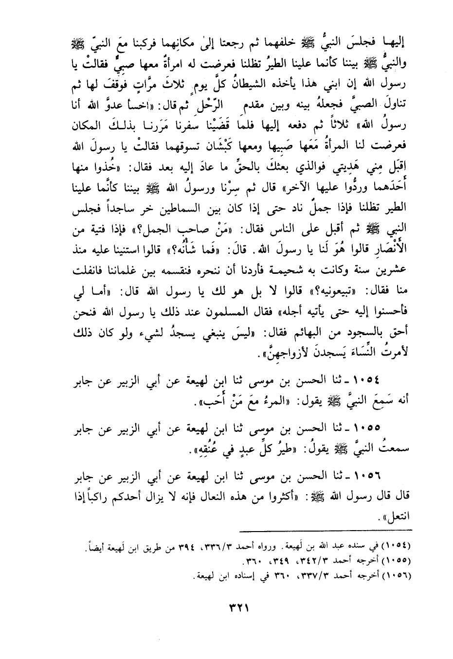 1056 - ثنا الْحَسَنُ بْنُ مُوسَى، ثَنَا ابْنُ لَهِيعَةَ، عَنْ أَبِي الزُّبَيْرِ، عَنْ جَابِرٍ قَالَ: قَالَ رَسُولُ اللَّهِ صَلَّى اللهُ عَلَيْهِ وَسَلَّمَ: «§أَكْثِرُوا مِنْ هَذِهِ النِّعَالِ، فَإِنَّهُ لَا يَزَالُ أَحَدُكُمْ رَاكِبًا إِذَا انْتَعَلَ»
