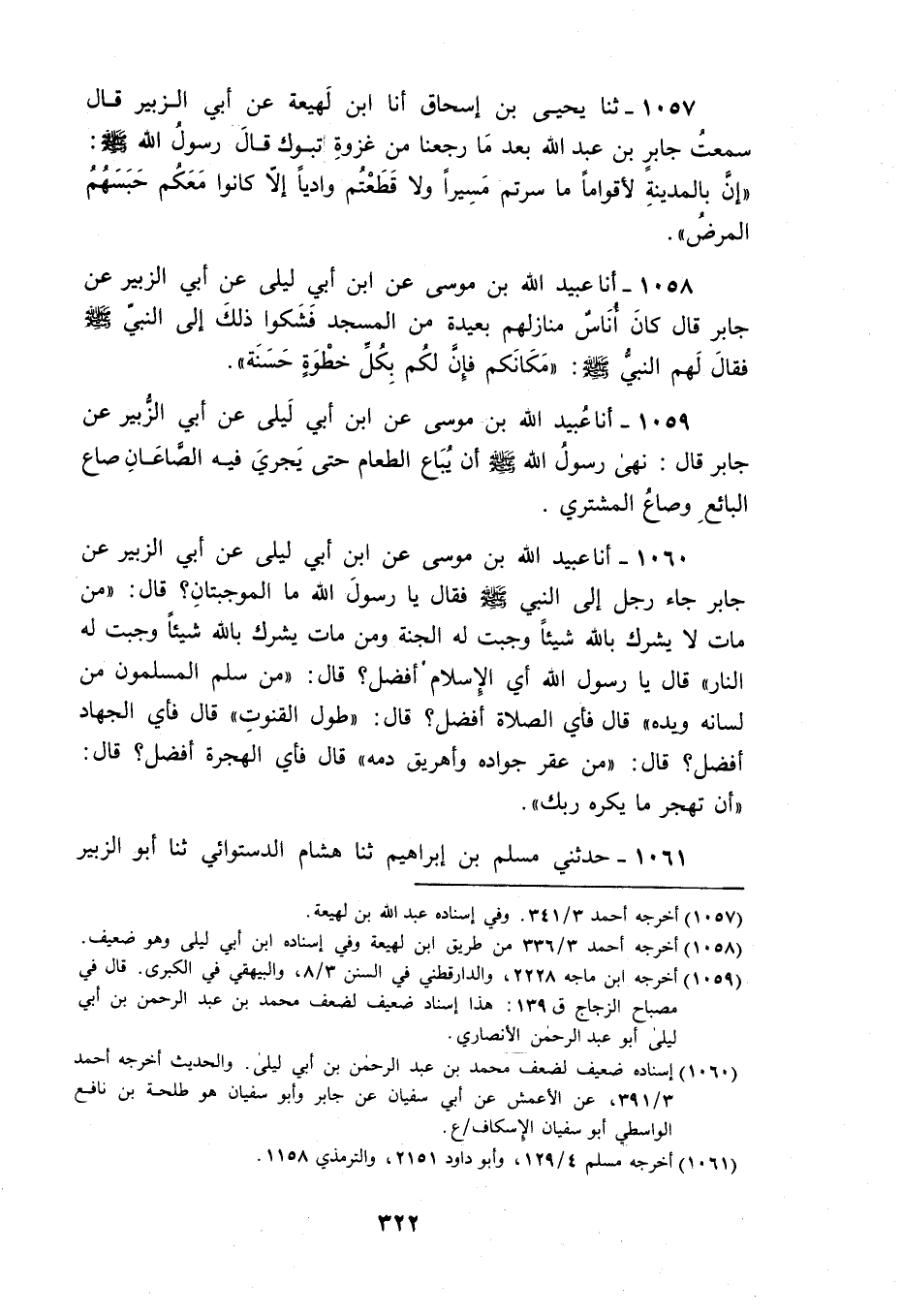 1060 - أنا عُبَيْدُ اللَّهِ بْنُ مُوسَى، عَنِ ابْنِ أَبِي لَيْلَى، عَنْ أَبِي الزُّبَيْرِ، عَنْ جَابِرٍ: جَاءَ رَجُلٌ إِلَى النَّبِيِّ صَلَّى اللهُ عَلَيْهِ وَسَلَّمَ، فَقَالَ: يَا رَسُولَ اللَّهِ، مَا الْمُوجِبَتَانِ؟ قَالَ: «§مَنْ مَاتَ لَا يُشْرِكُ بِاللَّهِ شَيْئًا وَجَبَتْ لَهُ الْجَنَّةُ، وَمَنْ مَاتَ يُشْرِكُ بِاللَّهِ شَيْئًا وَجَبَتْ لَهُ النَّارُ» قَالَ: يَا رَسُولَ اللَّهِ: أَيُّ الْإِسْلَامِ أَفْضَلُ؟ قَالَ: " مَنْ سَلِمَ الْمُسْلِمُونَ مِنْ لِسَانِهِ وَيَدِهِ قَالَ: فَأَيُّ الصَّلَاةِ أَفْضَلُ؟ قَالَ: «طُولُ الْقُنُوتِ» قَالَ: فَأَيُّ الْجِهَادِ أَفْضَلُ؟ قَالَ: «مَنْ عُقِرَ جَوَادُهُ وَأُهْرِيقَ دَمُهُ» قَالَ: فَأَيُّ الْهِجْرَةِ أَفْضَلُ؟ قَالَ: «أَنْ تَهْجُرَ مَا يَكْرَهُ رَبُّكَ»