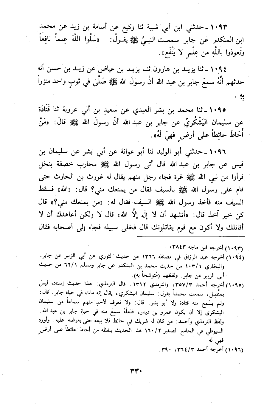 1093 - حَدَّثَنِي ابْنُ أَبِي شَيْبَةَ، ثَنَا وَكِيعٌ، عَنْ أُسَامَةَ بْنِ زَيْدٍ، عَنْ مُحَمَّدِ بْنِ الْمُنْكَدِرِ، عَنْ جَابِرٍ: سَمِعْتُ النَّبِيَّ صَلَّى اللهُ عَلَيْهِ وَسَلَّمَ، يَقُولُ: «§سَلُوا اللَّهَ عِلْمًا نَافِعًا، وَتَعَوَّذُوا بِاللَّهِ مِنْ عِلْمٍ لَا يَنْفَعُ»