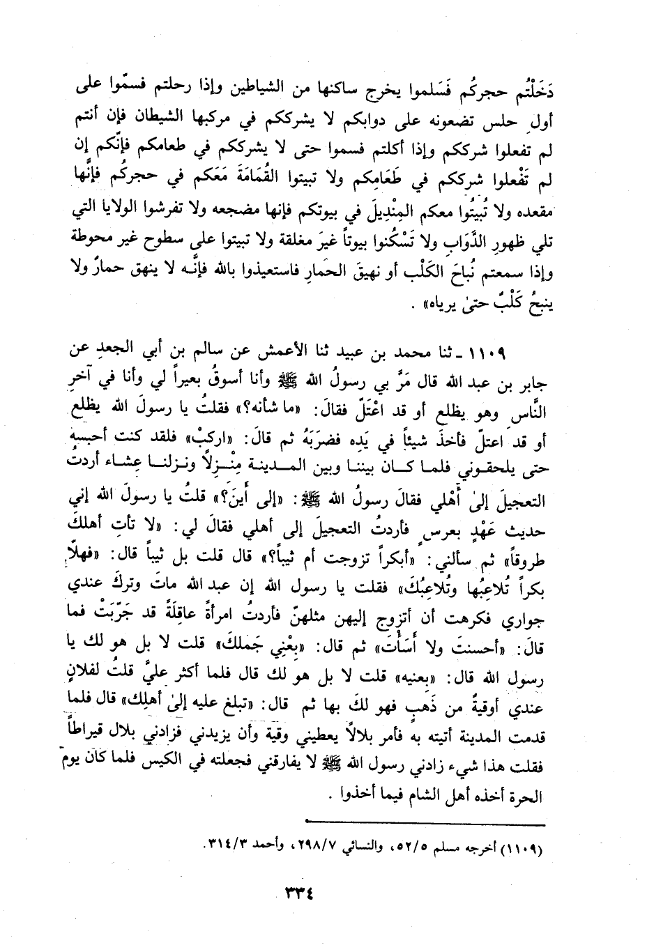 1109 - ثنا مُحَمَّدُ بْنُ عُبَيْدٍ، ثَنَا الْأَعْمَشُ، عَنْ سَالِمِ بْنِ أَبِي الْجَعْدِ، عَنْ جَابِرِ بْنِ عَبْدِ اللَّهِ قَالَ: مَرَّ بِي رَسُولُ اللَّهِ صَلَّى اللهُ عَلَيْهِ وَسَلَّمَ وَأَنَا أَسُوقُ بَعِيرًا لِي وَأَنَا فِي آخِرِ النَّاسِ وَهُوَ يَظْلَعُ أَوْ قَدِ اعْتَلَّ، فَقَالَ: «مَا شَأْنُهُ» ، فَقُلْتُ: يَا رَسُولَ اللَّهِ يَظْلَعُ أَوْ قَدِ اعْتَلَّ فَأَخَذَ شَيْئًا فِي يَدِهِ فَضَرَبَهُ، ثُمَّ قَالَ: «ارْكَبْ» فَلَقَدْ كُنْتُ أَحْبِسُهُ حَتَّى يَلْحَقُونِي فَلَمَّا كَانَ بَيْنَنَا وَبَيْنَ الْمَدِينَةِ مَنْزِلٌ وَنَزَلْنَا عِشَاءً أَرَدْتُ التَّعْجِيلَ إِلَى أَهْلِي فَقَالَ رَسُولُ اللَّهِ صَلَّى اللهُ عَلَيْهِ وَسَلَّمَ: «إِلَى أَيْنَ؟» ، قُلْتُ: يَا رَسُولَ اللَّهِ، إِنِّي حَدِيثُ عَهْدٍ بِعُرْسٍ فَأَرَدْتُ التَّعْجِيلَ إِلَى أَهْلِي فَقَالَ لِي: «§لَا تَأْتِ أَهْلَكَ طُرُوقًا» ، ثُمَّ سَأَلَنِي «أَبِكْرًا تَزَوَّجْتَ أَمْ ثَيِّبًا؟» قَالَ: قُلْتُ: بَلْ ثَيِّبًا قَالَ: «فَهَلَّا بِكْرًا تُلَاعِبُهَا وَتُلَاعِبُكَ» ، فَقُلْتُ: يَا رَسُولَ اللَّهِ، إِنَّ عَبْدَ اللَّهِ مَاتَ وَتَرَكَ عِنْدِي جَوَارِيَ فَكَرِهْتُ أَنْ أَتَزَوَّجَ إِلَيْهِنَّ مِثْلَهُنَّ فَأَرَدْتُ امْرَأَةً عَاقِلَةً قَدْ جَرَّبَتْ فَمَا قَالَ: «أَحْسَنْتَ وَلَا أَسَأْتَ» ، ثُمَّ قَالَ: «بِعْنِي جَمَلَكَ» ، قُلْتُ: لَا بَلْ هُوَ لَكَ يَا رَسُولَ اللَّهِ قَالَ: «بِعْنِيهِ» ، قُلْتُ: لَا بَلْ هُوَ لَكَ قَالَ: فَلَمَّا أَكْثَرَ عَلَيَّ قُلْتُ: لِفُلَانٍ عِنْدِي أُوقِيَّةٌ مِنْ ذَهَبٍ فَهُوَ لَكَ بِهَا، ثُمَّ قَالَ: «تَبْلَغُ عَلَيْهِ إِلَى أَهْلِكَ» قَالَ: فَلَمَّا قَدِمْتُ الْمَدِينَةَ أَتَيْتُهُ بِهِ فَأَمَرَ بِلَالًا يُعْطِينِي وُقِيَّةً وَأنْ يَزِيدَنِي فَزَادَنِي بِلَالٌ قِيرَاطًا فَقُلْتُ: هَذَا شَيْءٌ زَادَنِي رَسُولُ اللَّهِ صَلَّى اللهُ عَلَيْهِ وَسَلَّمَ لَا يُفَارِقُنِي فَجَعَلْتُهُ فِي الْكِيسِ فَلَمَّا كَانَ يَوْمُ الْحَرَّةِ أَخَذَهُ أَهْلُ الشَّامِ فِيمَا أَخَذُوا