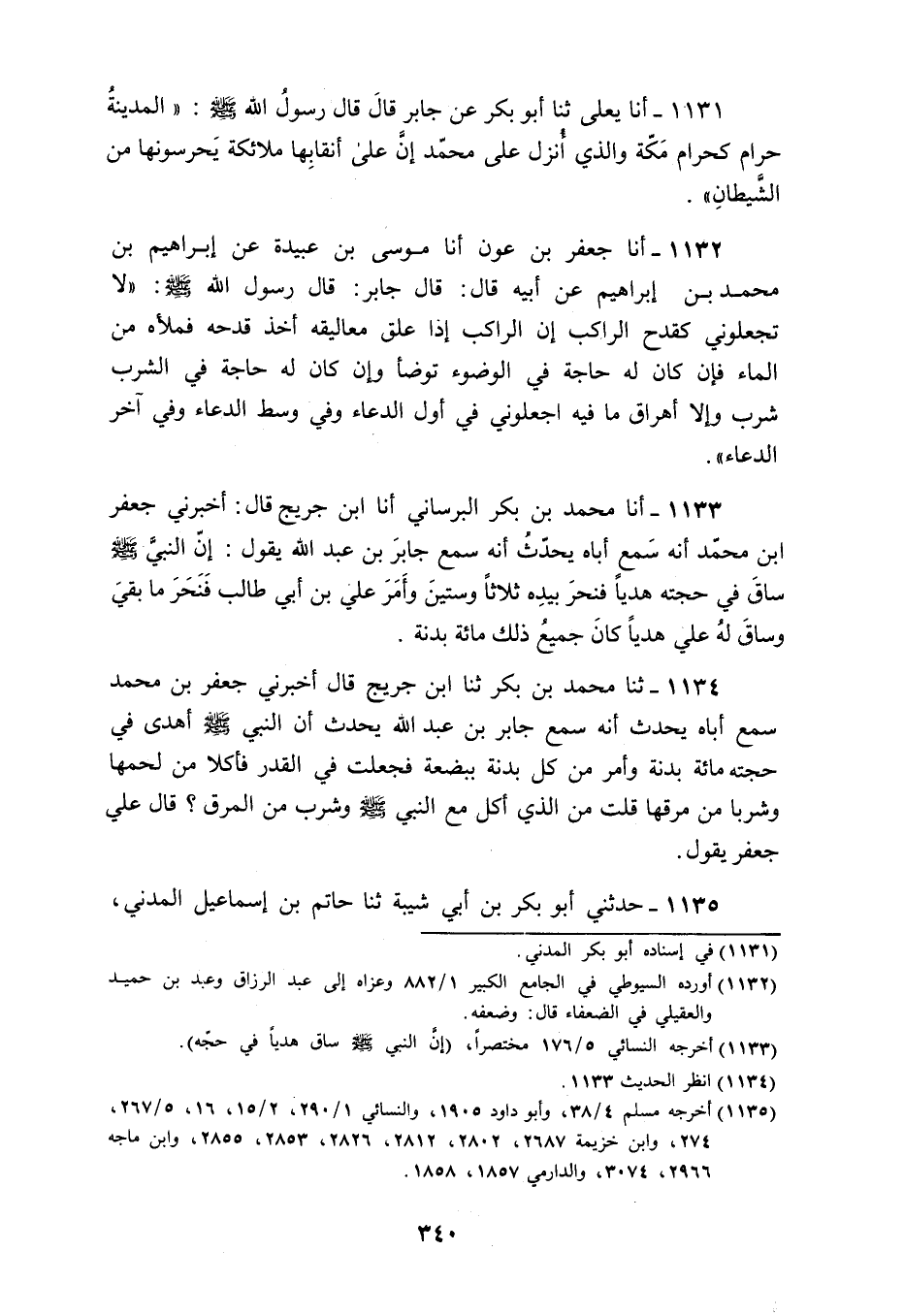 1133 - أنا مُحَمَّدُ بْنُ بَكْرٍ الْبُرْسَانِيُّ، أنا ابْنُ جُرَيْجٍ قَالَ: أَخْبَرَنِي جَعْفَرُ بْنُ مُحَمَّدٍ، أَنَّهُ سَمِعَ أَبَاهُ، يُحَدِّثُ أَنَّهُ سَمِعَ جَابِرَ بْنَ عَبْدِ اللَّهِ، يَقُولُ: «إِنَّ النَّبِيَّ صَلَّى اللهُ عَلَيْهِ وَسَلَّمَ §سَاقَ فِي حَجَّتِهِ هَدْيًا فَنَحَرَ بِيَدِهِ ثَلَاثًا وَسِتِّينَ وَأمَرَ عَلِيَّ بْنَ أَبِي طَالْبٍ فَنَحَرَ مَا بَقِيَ، وَسَاقَ لَهُ عَلِيٌّ هَدْيًا كَانَ جَمِيعُ ذَلِكَ مِائَةَ بَدَنَةٍ»