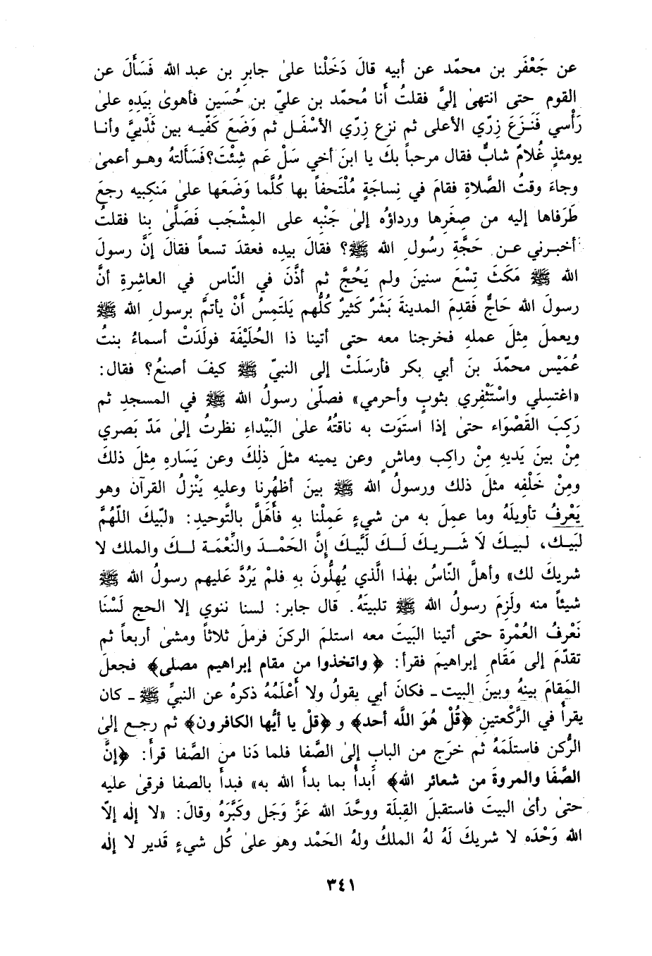 1135 - حَدَّثَنِي أَبُو بَكْرِ بْنُ أَبِي شَيْبَةَ، ثَنَا حَاتِمُ بْنُ إِسْمَاعِيلَ الْمَدَنِيُّ، عَنْ جَعْفَرِ بْنِ مُحَمَّدٍ، عَنْ أَبِيهِ قَالَ: دَخَلْنَا عَلَى جَابِرِ بْنِ عَبْدِ اللَّهِ، فَسَأَلَ عَنِ الْقَوْمِ حَتَّى انْتَهَى إِلَيَّ، فَقُلْتُ: أَنَا مُحَمَّدُ بْنُ عَلِيِّ بْنِ حُسَيْنٍ، فَأَهْوَى بِيَدِهِ عَلَى رَأْسِي فَنَزَعَ زِرِّي الْأَعْلَى، ثُمَّ نَزَعَ زِرِّي الْأَسْفَلَ ثُمَّ وَضَعَ كَفَّيهِ بَيْنَ ثَدْيَيَّ وَأَنَا يَوْمَئِذٍ غُلَامٌ شَابٌّ فَقَالَ: مَرْحَبًا بِكَ يَا ابْنَ أَخِي، سَلْ عَمَّ شِئْتَ. فَسَأَلْتُهُ وَهُوَ أَعْمَى، وَجَاءَ وَقْتُ الصَّلَاةِ فَقَامَ فِي نِسَاجَةٍ مُلْتَحِفًا بِهَا كُلَّمَا وَضَعَهَا عَلَى مَنْكِبَيِهِ رَجَعَ طَرَفَاهَا إِلَيْهِ مِنْ صِغَرِهَا، وَرِدَاؤُهُ إِلَى جَنْبِهِ عَلَى الْمِشْجَبِ، فَصَلَّى بِنَا، فَقُلْتُ: أَخْبِرْنِي عَنْ حَجَّةِ رَسُولِ اللَّهِ صَلَّى اللهُ عَلَيْهِ وَسَلَّمَ فَقَالَ بِيَدِهِ فَعَقَدَ تِسْعًا فَقَالَ: إِنَّ رَسُولَ اللَّهِ صَلَّى اللهُ عَلَيْهِ وَسَلَّمَ مَكَثَ تِسْعَ سِنِينَ ولَمْ يَحُجَّ، ثُمَّ أَذَّنَ فِي النَّاسِ فِي الْعَاشِرَةِ أَنَّ رَسُولَ اللَّهِ حَاجٌّ فَقَدِمَ الْمَدِينَةَ بَشَرٌ كَثِيرٌ كُلُّهُمْ يَلْتَمِسُ أَنْ يَأْتَمَّ بِرَسُولِ اللَّهِ صَلَّى اللهُ عَلَيْهِ وَسَلَّمَ وَيَعْمَلَ مِثْلَ عَمَلِهِ، فَخَرَجْنَا مَعَهُ حَتَّى أَتَيْنَا ذَا الْحُلَيْفَةِ فَوَلَدَتْ أَسْمَاءُ بِنْتُ عُمَيْسٍ مُحَمَّدَ بْنَ أَبِي بَكْرٍ، فَأَرْسَلَتْ إِلَى النَّبِيِّ صَلَّى اللهُ عَلَيْهِ وَسَلَّمَ كَيْفَ أَصْنَعُ؟ فقَالَ: " §اغْتَسِلِي وَاسْتَثْفِرِي بِثَوْبٍ وَأَحْرِمِي، فَصَلَّى رَسُولُ اللَّهِ صَلَّى اللهُ عَلَيْهِ وَسَلَّمَ فِي الْمَسْجِدِ، ثُمَّ رَكِبَ الْقَصْوَاءَ، حَتَّى إِذَا اسْتَوَتْ بِهِ نَاقَتُهُ عَلَى الْبَيْدَاءِ نَظَرْتُ إِلَى مَدِّ بَصَرِي مِنْ بَيْنَ يَدَيْهِ مِنْ رَاكِبٍ وَمَاشٍ وَعَنْ يَمِينِهِ مِثْلَ ذَلِكَ وَعَنْ يَسَارِهِ مِثْلَ ذَلِكَ وَمِنْ خَلْفِهِ مِثْلَ ذَلِكَ، وَرَسُولُ اللَّهِ صَلَّى اللهُ عَلَيْهِ وَسَلَّمَ بَيْنَ أَظْهُرِنَا وَعَلَيْهِ يَنْزِلُ الْقُرْآنُ وَهُوَ يَعْرِفُ تَأْوِيلَهُ، وَمَا عَمِلَ بِهِ مِنْ شَيْءٍ عَمِلْنَا بِهِ، فَأَهَلَّ بِالتَّوْحِيدِ لَبَّيْكَ اللَّهُمَّ لَبَّيْكَ، لَبَّيْكَ لَا شَرِيكَ لَكَ لَبَّيْكَ، إِنَّ الْحَمْدَ وَالنِّعْمَةَ لَكَ وَالْمُلْكَ لَا شَرِيكَ لَكَ، وَأَهَلَّ النَّاسُ بِهَذَا الَّذِي يُهِلُّونَ بِهِ، فَلَمْ يَرُدَّ عَلَيهم رَسُولُ اللَّهِ صَلَّى اللهُ عَلَيْهِ وَسَلَّمَ شَيْئًا مِنْهُ، وَلَزِمَ رَسُولُ اللَّهِ صَلَّى اللهُ عَلَيْهِ وَسَلَّمَ تَلْبِيَتَهُ. قَالَ جَابِرٌ: لَسْنَا نَنْوِي إِلَّا الْحَجَّ لَسْنَا نَعْرِفُ الْعُمْرَةَ حَتَّى إِذَا أَتَيْنَا الْبَيْتَ مَعَهُ اسْتَلَمَ الرُّكْنَ فَرَمَلَ ثَلَاثًا وَمَشَى أَرْبَعًا ثُمَّ تَقَدَّمَ إِلَى مَقَامِ إِبْرَاهِيمَ عَلَيْهِ السَّلَامُ، فَقَرَأَ {وَاتَّخِذُوا مِنْ مَقَامِ إِبْرَاهِيمَ مُصَلًّى} [البقرة: 125] فَجَعَلَ الْمَقَامَ بَيْنَهُ وَبَيْنَ الْبَيْتِ فَكَانَ أَبِي يَقُولُ: وَلَا أَعْلَمُهُ ذَكَرَهُ عَنِ النَّبِيِّ صَلَّى اللهُ عَلَيْهِ وَسَلَّمَ، كَانَ يَقْرَأُ فِي الرَّكْعَتَيْنِ: {قُلْ هُوَ اللَّهُ أَحَدٌ} [الإخلاص: 1] ، وَ {قُلْ يَا أَيُّهَا الْكَافِرُونَ} [الكافرون: 1] ، ثُمَّ رَجَعَ إِلَى الرُّكْنِ فَاسْتَلَمَهُ، ثُمَّ خَرَجَ مِنَ الْبَابِ إِلَى الصَّفَا، فَلَمَّا دَنَا مِنَ الصَّفَا قَرَأَ: {إِنَّ الصَّفَا وَالْمَرْوَةَ مِنْ شَعَائِرِ} [البقرة: 158] اللَّهِ أَبْدَأُ بِمَا بَدَأَ اللَّهُ بِهِ، فَبَدَأَ بِالصَّفَا فَرَقِيَ عَلَيْهِ حَتَّى رَأَى الْبَيْتَ فَاسْتَقْبَلَ الْ