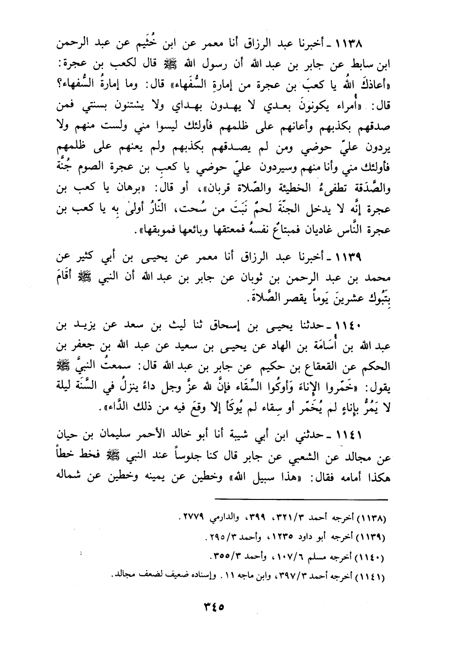 1138 - أَخْبَرَنَا عَبْدُ الرَّزَّاقِ، أنا مَعْمَرٌ، عَنِ ابْنِ خُثَيْمٍ، عَنْ عَبْدِ الرَّحْمَنِ بْنِ سَابِطٍ، عَنْ جَابِرِ بْنِ عَبْدِ اللَّهِ، أَنَّ رَسُولَ اللَّهِ صَلَّى اللهُ عَلَيْهِ وَسَلَّمَ قَالَ لِكَعْبِ بْنِ عُجْرَةَ: «§أَعَاذَكَ اللَّهُ يَا كَعْبَ بْنَ عُجْرَةَ مِنْ إِمَارَةِ السُّفَهَاءِ» قَالَ: وَمَا إِمَارَةُ السُّفَهَاءِ؟ قَالَ: «أُمَرَاءُ يَكونُونَ بَعْدِي لَا يَهْدُونَ بِهُدَاي وَلَا يَسْتَنُّونَ بِسُنَّتِي فَمَنْ صَدَّقَهُمْ بِكَذِبِهِمْ وَأعَانَهُمْ عَلَى ظُلْمِهُمْ فَأُولَئِكَ لَيْسُوا مِنِّي وَلَسْتُ مِنْهُمْ وَلَا يَرِدُونَ عَلَيَّ حَوْضِي وَمَنْ لَمْ يُصَدِّقْهُمْ بِكَذِبِهِمْ وَلَمْ يُعِنْهُمْ عَلَى ظُلْمِهُمْ فَأُولَئِكَ مِنِّي وَأَنَا مِنْهُمْ وَسَيَرِدُونُ عَلَيَّ حَوْضِي يَا كَعْبَ بْنَ عُجْرَةَ، الصَّوْمُ جُنَّةٌ وَالصَّدَقَةُ تُطْفِئُ الْخَطِيئَةَ وَالصَّلَاةُ قُرْبَانٌ» أَوْ قَالَ: " بُرْهَانٌ، يَا كَعْبَ بْنَ عُجْرَةَ، إِنَّهُ لَا يَدْخُلُ الْجَنَّةَ لَحْمٌ نَبَتَ مِنْ سُحْتِ، النَّارُ أَوْلَى بِهِ، يَا كَعْبَ بْنَ عُجْرَةَ، النَّاسُ غَادِيَانِ: فَمُبْتَاعٌ نَفْسَهُ فَمُعْتِقُهَا وَبَائِعُهَا فَمُوبِقُهَا "