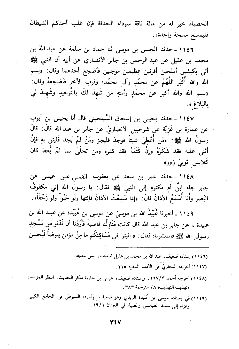 1146 - حَدَّثَنَا الْحَسَنُ بْنُ مُوسَى، ثَنَا حَمَّادُ بْنُ سَلَمَةَ، عَنْ عَبْدِ اللَّهِ بْنِ مُحَمَّدِ بْنِ عَقِيلٍ، عَنْ عَبْدِ الرَّحْمَنِ بْنِ جَابِرٍ الْأَنْصَارِيِّ، عَنْ أَبِيهِ، أَنَّ النَّبِيَّ صَلَّى اللهُ عَلَيْهِ وَسَلَّمَ أَتَى بِكَبْشَيْنِ أَمْلَحَيْنِ أَقْرَنَيْنِ عَظِيمَيْنِ مُوجِبَيْنِ فَأَضْجَعَ أَحَدَهُمَا، وَقَالَ: «§بِسْمِ اللَّهِ وَاللهُ أَكْبَرُ، اللهُمَّ عَنْ مُحَمَّدٍ وَآلِ مُحَمَّدٍ» ، وَقَرَّبَ الْآخَرَ فَأضْجَعَهُ، وَقَالَ: «بِسْمِ اللَّهِ وَاللهُ أَكْبَرُ، عَنْ مُحَمَّدٍ وَأُمَّتِهِ مَنْ شَهِدَ لَكَ بِالتَّوْحِيدِ وَشَهِدَ لِي بِالْبَلَاغِ»