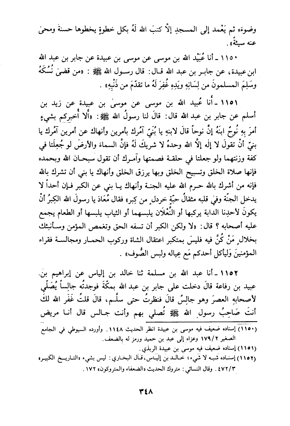 1150 - أنا عُبَيْدُ اللَّهِ بْنُ مُوسَى، عَنْ مُوسَى بْنِ عُبَيْدَةَ، عَنْ عَبْدِ اللَّهِ بْنِ عُبَيْدَةَ، عَنْ جَابِرِ بْنِ عَبْدِ اللَّهِ قَالَ: قَالَ رَسُولُ اللَّهِ صَلَّى اللهُ عَلَيْهِ وَسَلَّمَ: «§مَنْ قَضَى نُسُكَهُ وَسَلِمَ الْمُسْلِمُونَ مِنْ لِسَانِهِ وَيَدِهِ، غُفِرَ لَهُ مَا تَقَدَّمَ مِنْ ذَنْبِهِ»