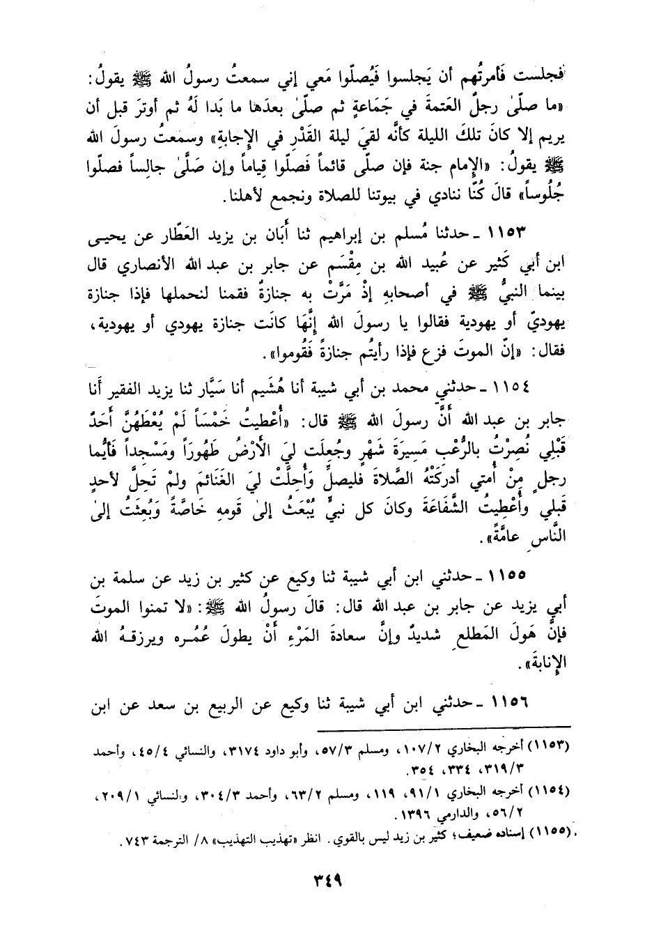 1154 - حَدَّثَنِي مُحَمَّدُ بْنُ أَبِي شَيْبَةَ، أنا هُشَيْمٌ، أنا سَيَّارٌ، ثَنَا يَزِيدُ الْفَقِيرُ، أنا جَابِرُ بْنُ عَبْدِ اللَّهِ، أَنَّ رَسُولَ اللَّهِ صَلَّى اللهُ عَلَيْهِ وَسَلَّمَ قَالَ: " §أُعْطِيتُ خَمْسًا لَمْ يُعْطَهُنَّ أَحَدٌ قَبْلِي: نُصِرْتُ بِالرُّعْبِ مَسِيرَةَ شَهْرٍ، وَجُعِلَتْ لِيَ الْأَرْضُ طَهُورًا، وَمَسْجِدًا فَأَيُّمَا رَجُلٌ مِنْ أُمَّتِي أَدْرَكَتْهُ الصَّلَاةُ فَلْيُصَلِّ، وَأُحِلَّتْ لِيَ الْغَنَائِمُ وَلَمْ تَحِلَّ لِأَحَدٍ قَبْلِي، وَأُعْطِيتُ الشَّفَاعَةَ وَكَانَ كُلُّ نَبِيٍّ يُبْعَثُ إِلَى قَوْمِهِ خَاصَّةً وَبُعِثْتُ إِلَى النَّاسِ عَامَّةً "