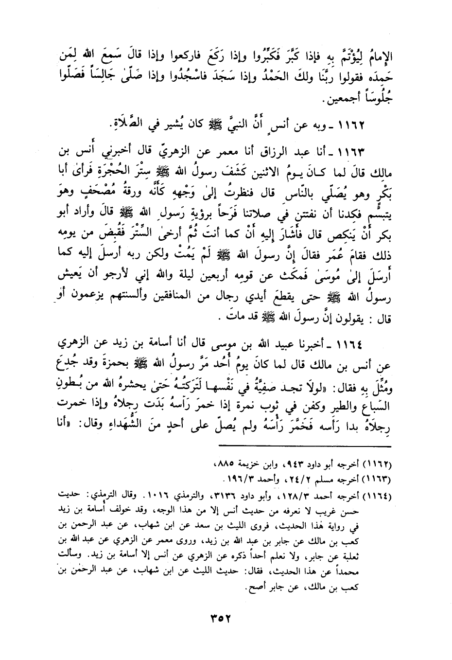 1162 - وَبِهِ عَنْ أَنَسٍ: «أَنَّ النَّبِيَّ صَلَّى اللهُ عَلَيْهِ وَسَلَّمَ §كَانَ يُشِيرُ فِي الصَّلَاةِ»