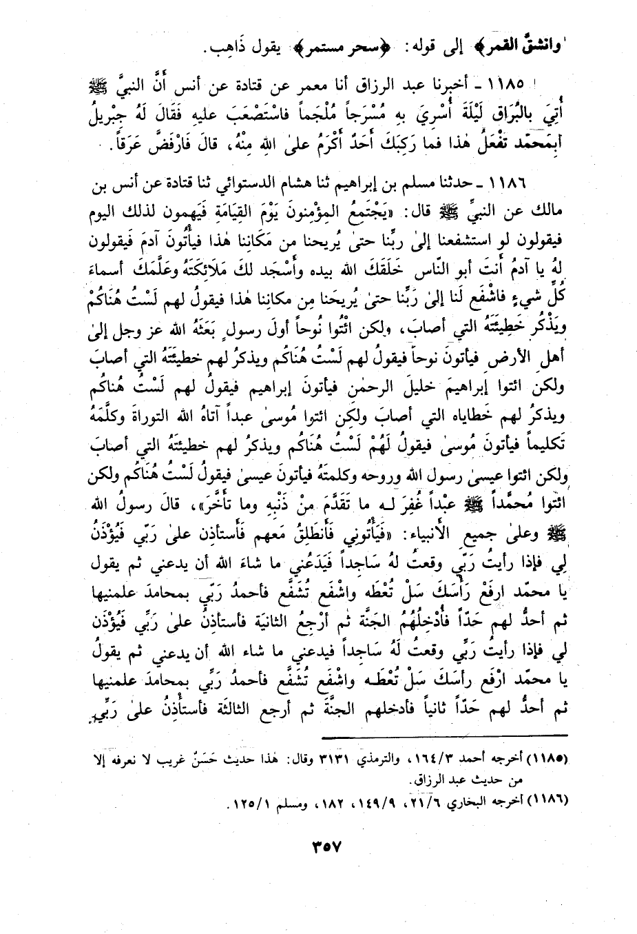 1186 - حَدَّثَنَا مُسْلِمُ بْنُ إِبْرَاهِيمَ، ثَنَا هِشَامٌ الدَّسْتُوَائِيُّ، ثَنَا قَتَادَةَ، عَنْ أَنَسِ بْنِ مَالْكٍ، عَنِ النَّبِيِّ صَلَّى اللهُ عَلَيْهِ وَسَلَّمَ قَالَ: " §يَجْتَمِعُ الْمُؤْمِنُونَ يَوْمَ الْقِيَامَةِ فَيَهُمُّونَ لِذَلِكَ الْيَوْمِ، فَيَقُولُونَ: لَوِ اسْتَشْفَعْنَا إِلَى رَبِّنَا حَتَّى يُرِيحَنَا مِنْ مَكَانِنَا هَذَا، فَيَأْتُونَ آدَمَ، فَيَقُولُونَ لَهُ: يَا آدَمُ، أَنْتَ أَبُو النَّاسِ خَلَقَكَ اللَّهُ بِيَدِهِ وَأَسْجَدَ لَكَ مَلَائِكَتَهُ وَعَلَّمَكَ أَسْمَاءَ كُلِّ شَيْءٍ فَاشْفَعْ لَنَا إِلَى رَبِّنَا حَتَّى يُرِيحَنَا مِنْ مَكَانِنَا هَذَا، فَيَقُولُ لَهُمْ: لَسْتُ هُنَاكُمْ وَيَذْكُرُ خَطِيئَتَهُ الَّتِي أَصَابَ وَلَكِنِ ائْتُوا نُوحًا أَوَّلَ رَسُولٍ بَعَثَهُ اللَّهُ عَزَّ وَجَلَّ إِلَى أَهْلِ الْأَرْضِ فَيَأْتُونَ نُوحًا فَيَقُولُ لَهُمْ: لَسْتُ هُنَاكُمْ وَيَذْكُرُ لَهُمْ خَطِيئَتَهُ الَّتِي أَصَابَ وَلَكِنِ ائْتُوا إِبْرَاهِيمَ خَلِيلَ الرَّحْمَنِ فَيَأْتُونَ إِبْرَاهِيمَ، فَيَقُولُ لَهُمْ: لَسْتُ هُنَاكُمْ وَيَذْكُرُ لَهُمْ خَطَايَاهُ الَّتِي أَصَابَ وَلَكِنِ ائْتُوا مُوسَى عَبْدًا آتَاهُ اللَّهُ التَّوْرَاةَ وَكَلَّمَهُ تَكْلِيمًا فَيَأْتُونَ مُوسَى، فَيَقُولُ لَهُمْ لَسْتَ هُنَاكُمْ وَيَذْكُرُ لَهُمْ خَطِيئَتَهُ الَّتِي أَصَابَ وَلَكِنِ ائْتُوا عِيسَى رَسُولَ اللَّهِ وَرُوحَهُ وَكَلِمَتَهُ فَيَأْتُونَ عِيسَى فَيَقُولُ: لَسْتُ هُنَاكُمْ وَلَكِنِ ائْتُوا مُحَمَّدًا صَلَّى اللهُ عَلَيْهِ وَسَلَّمَ عَبْدًا غُفِرَ لَهُ مَا تَقَدَّمَ مِنْ ذَنْبِهِ وَمَا تَأَخَّرَ قَالَ رَسُولُ اللَّهِ صَلَّى اللهُ عَلَيْهِ وَسَلَّمَ وَعَلَى جَمِيعِ الْأَنْبِيَاءِ " فَيَأْتُونِي فَأنْطَلِقُ مَعَهُمْ فَأَسْتَأْذِنُ عَلَى رَبِّي فَيُؤْذَنُ لِي فَإِذَا رَأَيْتُ رَبِّي وَقَعْتُ لَهُ سَاجِدًا فَيَدَعُنِي مَا شَاءَ اللَّهُ أَنْ يَدَعَنِي ثُمَّ يَقُولُ: يَا مُحَمَّدُ ارْفَعْ رَأْسَكَ سَلْ تُعْطَهْ وَاشْفَعْ تُشَفَّعْ، فَأَحْمَدُ رَبِّي بِمَحَامِدَ عَلَّمَنِيهَا، ثُمَّ أَحُدُّ لَهُمْ حَدًّا فَأُدْخِلُهُمُ الْجَنَّةَ ثُمَّ أَرْجِعُ الثَّانِيَةَ فَأَسْتَأذِنُ عَلَى رَبِّي فَيُؤْذَنُ لِي فَإِذَا رَأَيْتُ رَبِّي وَقَعْتُ لَهُ سَاجِدًا فَيَدَعُنِي مَا شَاءَ اللَّهُ أَنْ يَدَعَنِي ثُمَّ يَقُولُ يَا مُحَمَّدُ، ارْفَعْ رَأْسَكَ سَلْ تُعْطَهْ وَاشْفَعْ تُشَفَّعْ فَأَحْمَدُ رَبِّي بِمَحَامِدَ عَلَّمَنِيهَا، ثُمَّ أَحُدُّ لَهُمْ حَدًّا ثَانِيًا فَأُدْخِلُهُمُ الْجَنَّةَ ثُمَّ أَرْجِعُ الثَّالِثَةَ فَأَسْتَأْذِنُ عَلَى رَبِّي فَيُؤْذَنُ لِي فَإِذَا رَأَيْتُ رَبِّي وَقَعْتُ لَهُ سَاجِدًا فَيَدَعُنِي مَا شَاءَ اللَّهُ أَنْ يَدَعَنِي ثُمَّ يَقُولُ: يَا مُحَمَّدُ ارْفَعْ رَأْسَكَ سَلْ تُعْطَهْ وَاشْفَعْ تُشَفَّعْ فَأَحْمَدُ رَبِّي بِمَحَامِدَ عَلَّمَنِيهَا ثُمَّ أَحُدُّ لَهُمْ حَدًّا ثَالِثًا فَأُدْخِلُهُمُ الْجَنَّةَ حَتَّى أَرْجِعَ فَأَقُولُ: يَا رَبِّ، مَا بَقِيَ فِي النَّارِ إِلَّا مَنْ وَجَبَ عَلَيْهِ الْخُلُودُ أَوْ حَبَسَهُ الْقُرْآنُ "