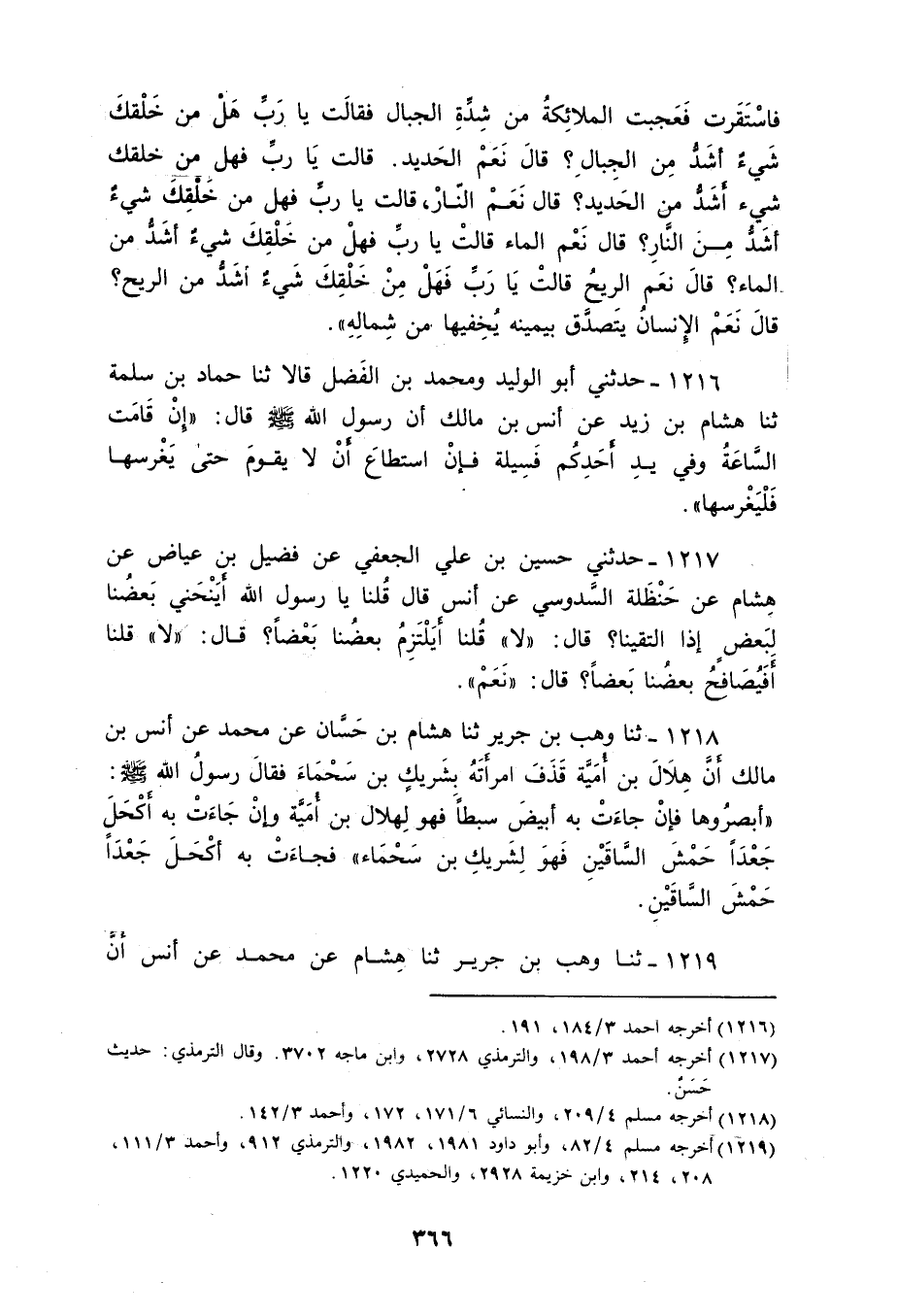 1216 - حَدَّثَنِي أَبُو الْوَلِيدِ، وَمُحَمَّدُ بْنُ الْفَضْلِ، قَالَا: ثَنَا حَمَّادُ بْنُ سَلَمَةَ، ثَنَا هِشَامُ بْنُ زَيْدٍ، عَنْ أَنَسِ بْنِ مَالْكٍ: أَنَّ رَسُولَ اللَّهِ صَلَّى اللهُ عَلَيْهِ وَسَلَّمَ قَالَ: «§إِنْ قَامَتِ السَّاعَةُ وَفِي يَدِ أَحَدِكُمْ فَسِيلَةً، فَإِنِ اسْتَطَاعَ أَنْ لَا يَقُومَ حَتَّى يَغْرِسَهَا فَلْيَغْرِسْهَا»