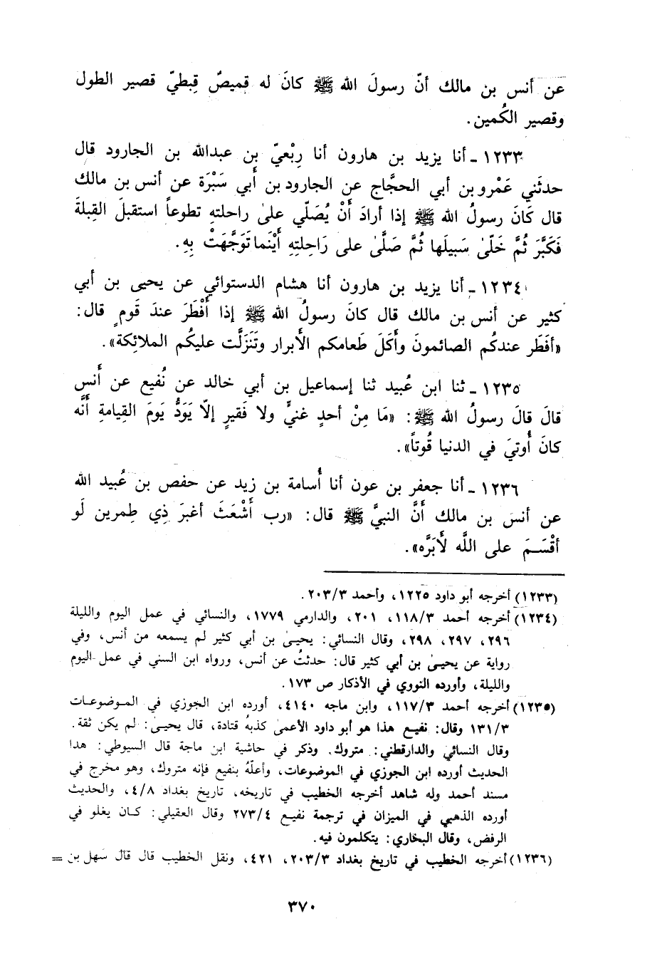 1233 - أنا يَزِيدُ بْنُ هَارُونَ، أنا رِبْعِيُّ بْنُ عَبْدِ اللَّهِ بْنِ الْجَارُودِ قَالَ: حَدَّثَنِي عَمْرُو بْنُ أَبِي الْحَجَّاجِ، عَنِ الْجَارُودِ بْنِ أَبِي سَبْرَةَ، عَنْ أَنَسِ بْنِ مَالْكٍ قَالَ: «كَانَ رَسُولُ اللَّهِ صَلَّى اللهُ عَلَيْهِ وَسَلَّمَ §إِذَا أَرَادَ أَنْ يُصَلِّيَ عَلَى رَاحِلَتِهِ تَطَوُّعًا اسْتَقْبَلَ الْقِبْلَةَ، فَكَبَّرَ ثُمَّ خَلَّى سَبِيلَهَا، ثُمَّ صَلَّى عَلَى رَاحِلَتِهِ أَينمَا تَوَجَّهَتْ بِهِ»