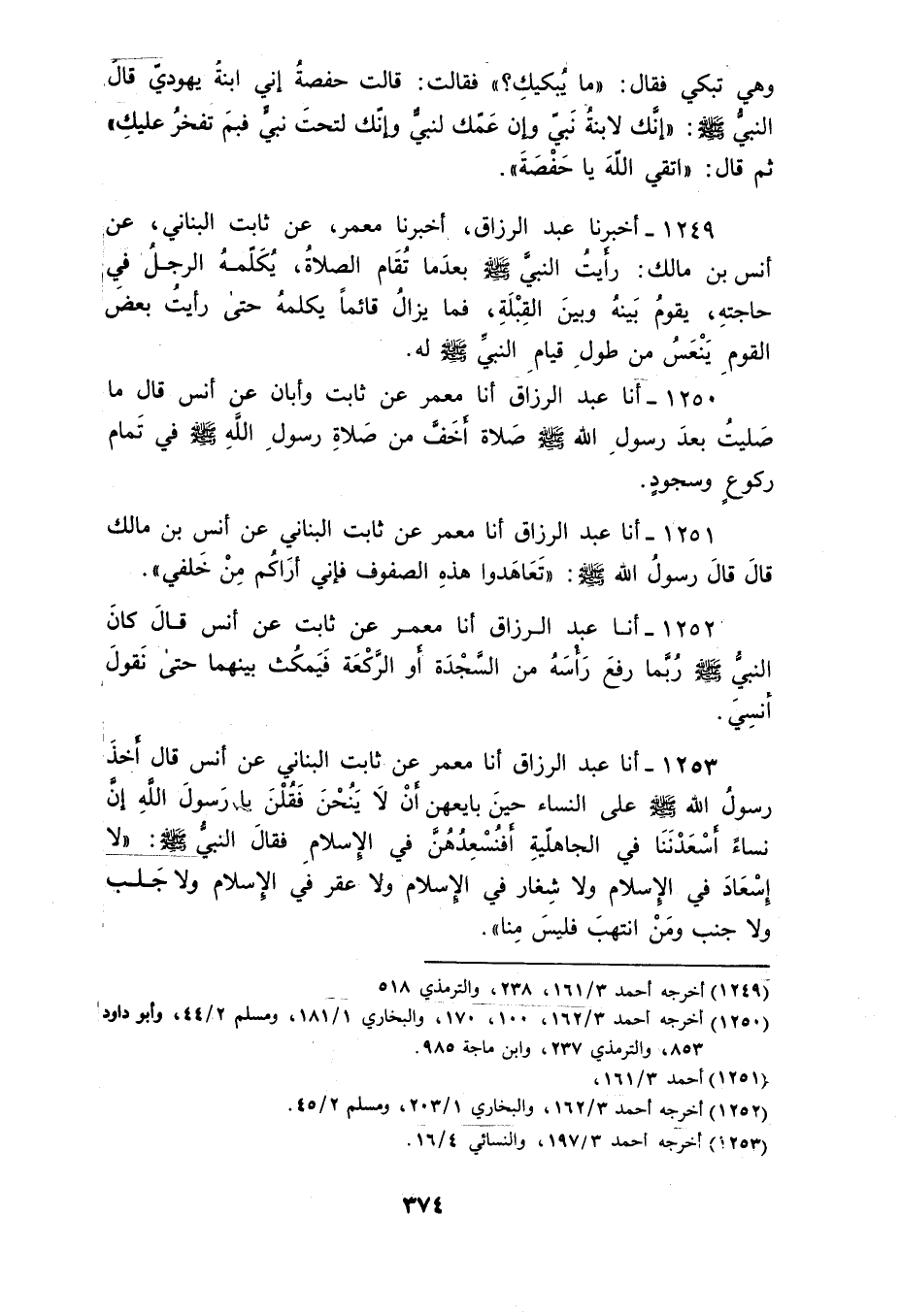 1253 - أنا عَبْدُ الرَّزَّاقِ، أنا مَعْمَرٌ، عَنْ ثَابِتٍ الْبُنَانِيِّ، عَنْ أَنَسٍ قَالَ: أَخَذَ رَسُولُ اللَّهِ صَلَّى اللهُ عَلَيْهِ وَسَلَّمَ عَلَى النِّسَاءِ حِينَ بَايَعَهُنَّ أَنْ لَا يَنُحْنَ، فَقُلْنَ: يَا رَسُولَ اللَّهِ، إِنَّ نِسَاءَ أَسْعَدْنَنَا فِي الْجَاهِلِيَّةِ أَفَنُسْعِدُهُنَّ فِي الْإِسْلَامِ؟ فَقَالَ النَّبِيُّ صَلَّى اللهُ عَلَيْهِ وَسَلَّمَ: «§لَا إِسْعَادَ فِي الْإِسْلَامِ، وَلَا شِغَارَ فِي الْإِسْلَامِ، وَلَا عَقْرَ فِي الْإِسْلَامِ، وَلَا جَلَبَ، وَلَا جَنَبَ، وَمَنِ انْتَهَبَ فَلَيْسَ مِنَّا»