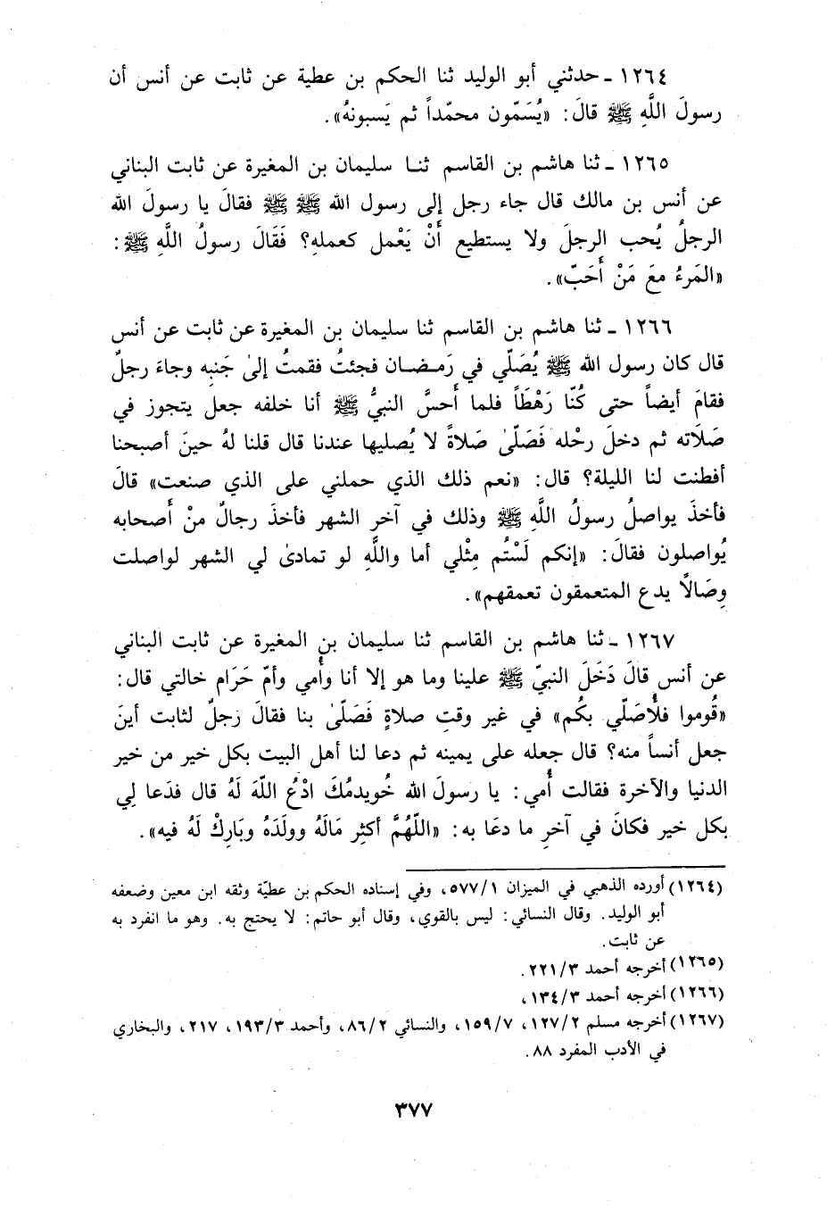 1265 - ثنا هَاشِمُ بْنُ الْقَاسِمِ، ثَنَا سُلَيْمَانُ بْنُ الْمُغِيرَةِ، عَنْ ثَابِتٍ الْبُنَانِيِّ، عَنْ أَنَسِ بْنِ مَالْكٍ قَالَ: جَاءَ رَجُلٌ إِلَى رَسُولِ اللَّهِ صَلَّى اللهُ عَلَيْهِ وَسَلَّمَ، فَقَالَ: يَا رَسُولَ اللَّهِ، الرَّجُلُ يُحِبُّ الرَّجُلَ وَلَا يَسْتَطِيعُ أَنْ يَعْمَلَ كَعَمَلِهِ، فَقَالَ رَسُولُ اللَّهِ صَلَّى اللهُ عَلَيْهِ وَسَلَّمَ: «§الْمَرْءُ مَعَ مَنْ أَحَبَّ»