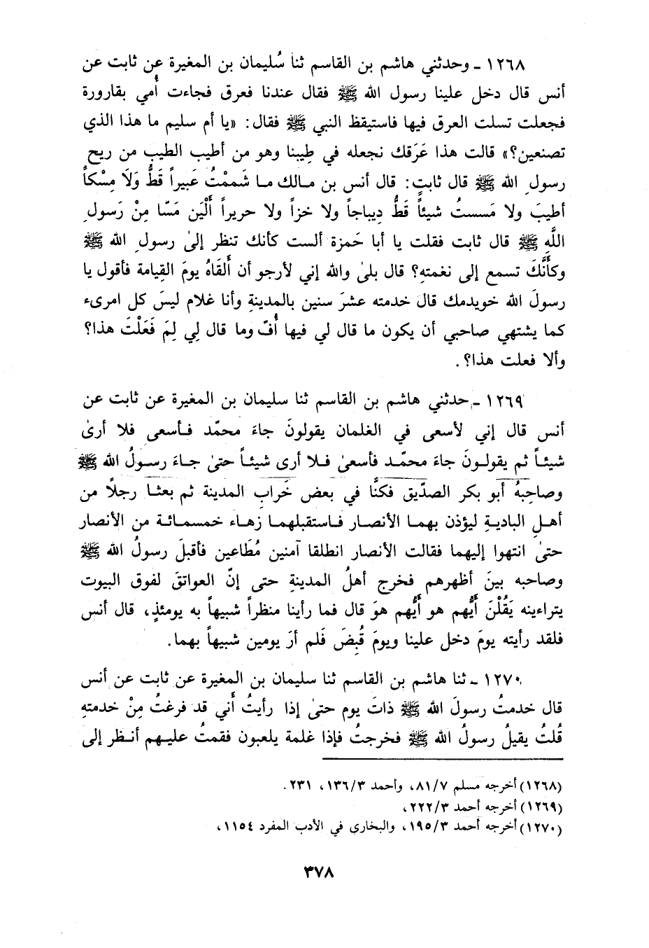 1268 - وَحَدَّثَنِي هَاشِمُ بْنُ الْقَاسِمِ، ثَنَا سُلَيْمَانُ بْنُ الْمُغِيرَةِ، عَنْ ثَابِتٍ، عَنْ أَنَسٍ قَالَ: دَخَلَ عَلَيْنَا رَسُولُ اللَّهِ صَلَّى اللهُ عَلَيْهِ وَسَلَّمَ، فَقَالَ: عِنْدَنَا فَعَرِقَ فَجَاءَتْ أُمِّي بِقَارُورَةٍ فَجَعَلَتْ تَسْلِتُ الْعَرَقَ فِيهَا، فَاسْتَيْقَظَ النَّبِيُّ صَلَّى اللهُ عَلَيْهِ وَسَلَّمَ، فَقَالَ: «§يَا أُمَّ سُلَيْمٍ، مَا هَذَا الَّذِي تَصْنَعِينَ؟» قَالَتْ: هَذَا عَرَقُكَ فِي طِيبِنَا وَهُوَ مِنْ أَطْيَبِ الطِّيبِ مِنْ رِيحِ رَسُولِ اللَّهِ صَلَّى اللهُ عَلَيْهِ وَسَلَّمَ، قَالَ ثَابِتٌ: قَالَ أَنَسُ بْنُ مَالْكٍ: مَا شَمَمْتُ عَبِيرًا قَطُّ وَلَا مِسْكًا أَطْيَبَ، وَلَا مَسَسْتُ شَيْئًا قَطُّ دِيبَاجًا وَلَا خَزًّا وَلَا حَرِيرًا أَلْيَنَ مَسًّا مِنْ رَسُولِ اللَّهِ صَلَّى اللهُ عَلَيْهِ وَسَلَّمَ، قَالَ ثَابِتٌ: فَقُلْتُ: يَا أَبَا حَمْزَةَ، أَلَسْتَ كَأَنَّكَ تَنْظُرُ إِلَى رَسُولِ اللَّهِ صَلَّى اللهُ عَلَيْهِ وَسَلَّمَ وَكَأَنَّكَ تَسْمَعُ إِلَى نَغَمَتِهِ؟ قَالَ: بَلَى، وَاللَّهِ إِنِّي لَأَرْجُو أَنْ أَلْقَاهُ يَوْمَ الْقِيَامَةِ فَأَقُولُ: يَا رَسُولَ اللَّهِ، خُوَيْدِمُكَ قَالَ: خَدَمْتُهُ عَشْرَ سِنِينَ بِالْمَدِينَةِ وَأَنَا غُلَامٌ لَيْسَ كُلُّ امْرِئٍ كَمَا يَشْتَهِي صَاحِبِي أَنْ يَكُونَ مَا قَالَ لِي فِيهَا، أُفٍّ، وَمَا قَالَ لِي: لِمَ فَعَلْتَ هَذَا، وَألَا فَعَلْتَ هَذَا
