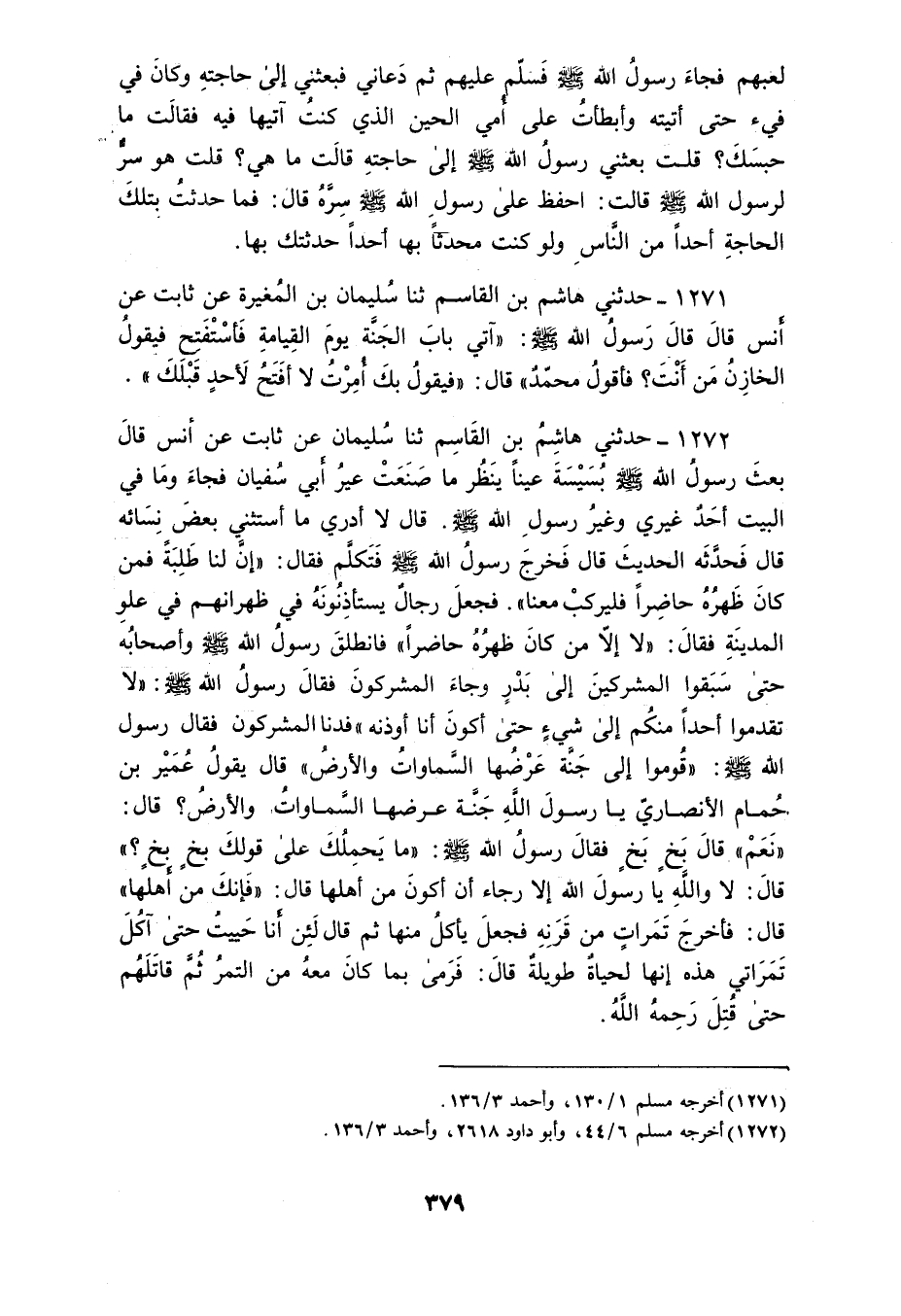 1271 - حَدَّثَنِي هَاشِمُ بْنُ الْقَاسِمِ، ثَنَا سُلَيْمَانُ بْنُ الْمُغِيرَةِ، عَنْ ثَابِتٍ، عَنْ أَنَسٍ قَالَ: قَالَ رَسُولُ اللَّهِ صَلَّى اللهُ عَلَيْهِ وَسَلَّمَ: " §آتِي بَابَ الْجَنَّةِ يَوْمَ الْقِيَامَةِ، فَأَسْتَفْتِحُ فَيَقُولُ الْخَازِنُ: مَنْ أَنْتَ؟ فَأَقُولُ: مُحَمَّدٌ قَالَ: فَيَقُولُ: بِكَ أُمِرْتُ لَا أَفْتَحُ لِأَحَدٍ قَبْلَكَ "
