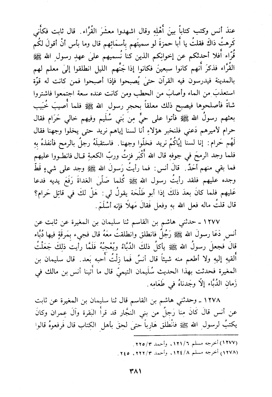1277 - حَدَّثَنِي هَاشِمُ بْنُ الْقَاسِمِ، ثَنَا سُلَيْمَانُ بْنُ الْمُغِيرَةِ، عَنْ ثَابِتٍ، عَنْ أَنَسٍ: «§دَعَا رَسُولُ اللَّهِ صَلَّى اللهُ عَلَيْهِ وَسَلَّمَ رَجُلٌ فَانْطَلَقَ وَانْطَلَقْتُ مَعَهُ» قَالَ: فَجِيءَ بِمَرَقَةٍ فِيهَا دُبَّاءٌ قَالَ: فَجَعَلَ رَسُولُ اللَّهِ صَلَّى اللهُ عَلَيْهِ وَسَلَّمَ يَأْكُلُ ذَلِكَ الدُّبَّاءَ وَيُعْجِبُهُ فَلَمَّا رَأَيْتُ ذَلِكَ، جَعَلْتُ أَلْقِيهِ إِلَيْهِ وَلَا أَطْعَمُ مِنْهُ شَيْئًا، قَالَ أَنَسٌ: فَمَا زِلْتُ أُحِبُّهُ بَعْدُ، قَالَ سُلَيْمَانُ بْنُ الْمُغِيرَةِ: فَحَدَّثْتُ بِهَذَا الْحَدِيثِ سُلَيْمَانَ التَّيْمِيَّ قَالَ: مَا أَتَيْنَا أَنَسَ بْنَ مَالْكٍ فِي زَمَانِ الدُّبَّاءِ إِلَّا وَجَدْنَاهُ فِي طَعَامِهِ