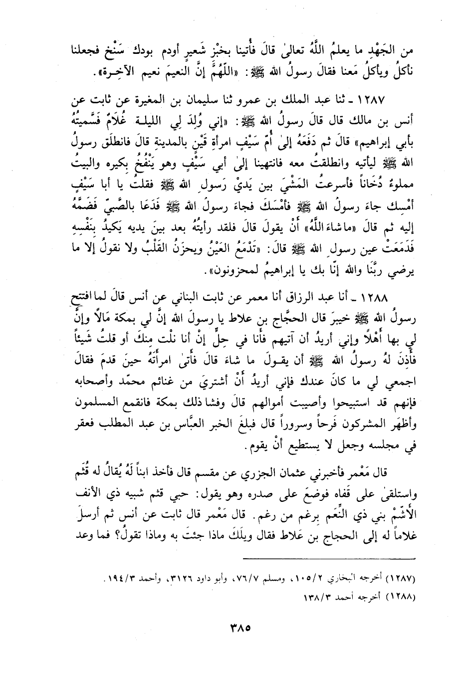 1287 - ثنا عَبْدُ الْمَلِكِ بْنُ عَمْرٍو، ثَنَا سُلَيْمَانُ بْنُ الْمُغِيرَةِ، عَنْ ثَابِتٍ، عَنْ أَنَسِ بْنِ مَالْكٍ قَالَ: قَالَ رَسُولُ اللَّهِ صَلَّى اللهُ عَلَيْهِ وَسَلَّمَ: «§إِنِّي وُلِدَ لِي اللَّيْلَةَ غُلَامٌ فَسَمَّيْتُهُ بِأَبِي إِبْرَاهِيمَ» قَالَ: ثُمَّ دَفَعَهُ، إِلَى أُمِّ سَيْفٍ امْرَأَةِ قَيْنٍ بِالْمَدِينَةِ " قَالَ: فَانْطَلَقَ رَسُولُ اللَّهِ صَلَّى اللهُ عَلَيْهِ وَسَلَّمَ لِيَأْتِيَهُ، وَانْطَلَقْتُ مَعَهُ فَانْتَهَيْنَا إِلَى أَبِي سَيْفٍ وَهُوَ يَنْفُخُ بِكِيرِهِ وَالْبَيْتُ مَمْلُوءٌ دُخَانَا، فَأَسْرَعْتُ الْمَشْيَ بَيْنَ يَدَيْ رَسُولِ اللَّهِ صَلَّى اللهُ عَلَيْهِ وَسَلَّمَ، فَقُلْتُ: يَا أَبَا سَيْفٍ أَمْسِكْ، جَاءَ رَسُولُ اللَّهِ صَلَّى اللهُ عَلَيْهِ وَسَلَّمَ فَأمْسَكَ، فَجَاءَ رَسُولُ اللَّهِ صَلَّى اللهُ عَلَيْهِ وَسَلَّمَ فَدَعَا بِالصَّبِيِّ فَضَمَّهُ إِلَيْهِ، ثُمَّ قَالَ: «مَا شَاءَ اللَّهُ» ، أَنْ يَقُولُ: قَالَ: فَلَقَدْ رَأَيْتُهُ بَعْدُ بَيْنَ يَدَيْهُ، يَكِيدُ بِنَفْسِهِ فَدَمَعَتْ عَيْنُ رَسُولِ اللَّهِ صَلَّى اللهُ عَلَيْهِ وَسَلَّمَ قَالَ: «تَدْمَعُ الْعَيْنُ وَيَحْزَنُ الْقَلْبُ، وَلَا نَقُولُ إِلَّا مَا يُرْضِي رَبَّنَا وَاللهِ، إِنَا بِكَ يَا إِبْرَاهِيمُ لَمَحْزُونُونَ»