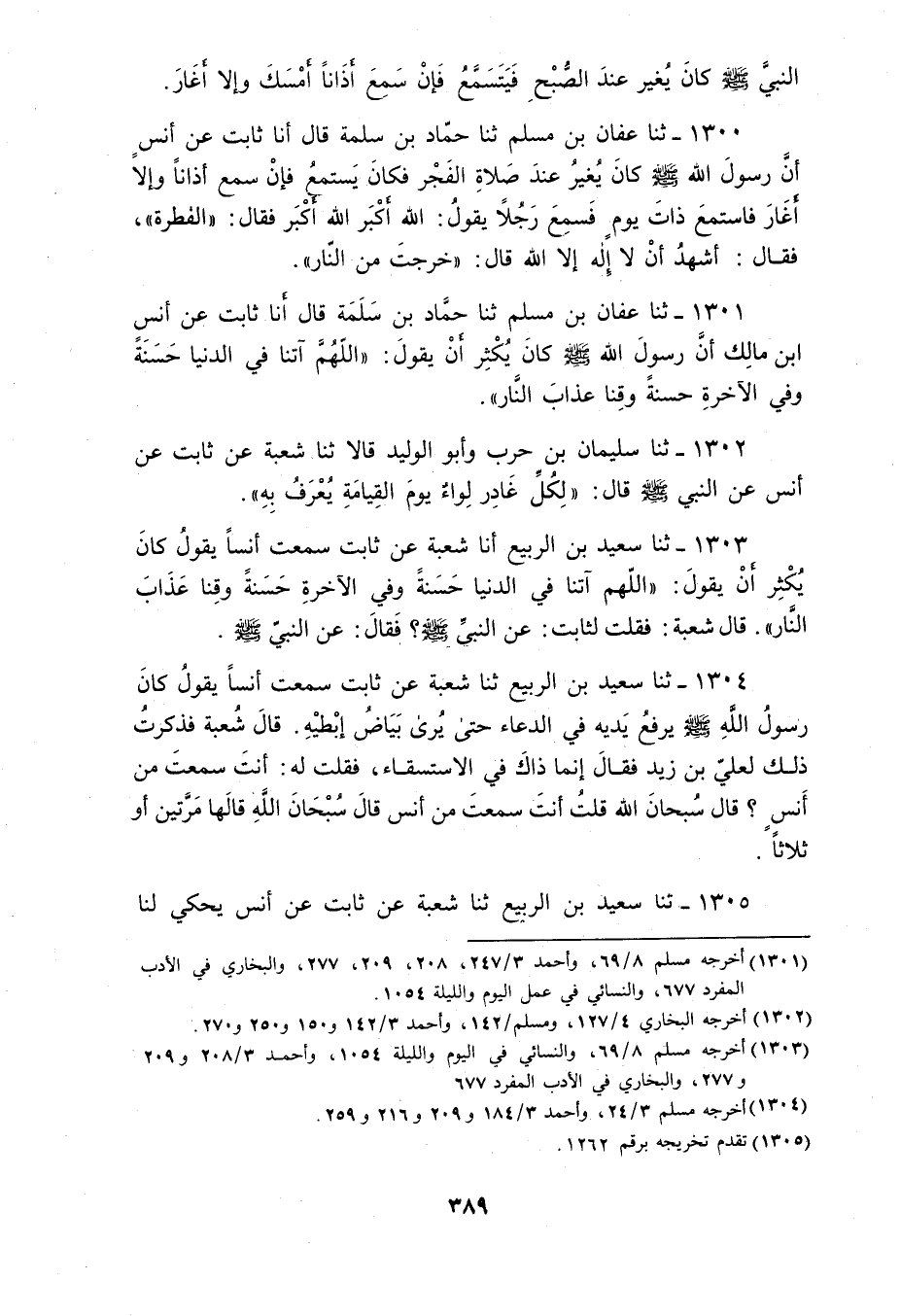1300 - ثنا عَفَّانُ بْنُ مُسْلِمٍ، ثَنَا حَمَّادُ بْنُ سَلَمَةَ قَالَ: أنا ثَابِتٌ، عَنْ أَنَسٍ، أَنَّ رَسُولَ اللَّهِ صَلَّى اللهُ عَلَيْهِ وَسَلَّمَ، كَانَ يُغِيرُ عِنْدَ صَلَاةِ الْفَجْرِ، فَكَانَ يَسْتَمِعُ فَإِنْ سَمِعَ أَذَانَا، وَإِلَّا أَغَارَ، فَاسْتَمَعَ ذَاتَ يَوْمٍ §فَسَمِعَ رَجُلًا يَقُولُ: اللَّهُ أَكْبَرُ اللَّهُ أَكْبَرُ، فَقَالَ: «الْفِطْرَةُ» فَقَالَ: أَشْهَدُ أَنْ لَا إِلَهَ إِلَّا اللَّهُ قَالَ: «خَرَجْتَ مِنَ النَّارِ»