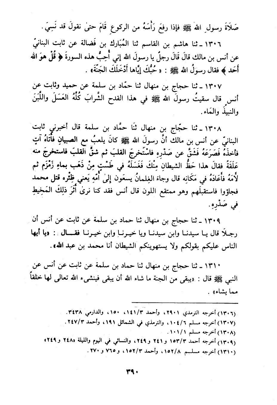 1308 - ثنا حَجَّاجُ بْنُ مِنْهَالٍ، ثَنَا حَمَّادُ بْنُ سَلَمَةَ قَالَ: أَخْبَرَنِي ثَابِتٌ الْبُنَانِيُّ، عَنْ أَنَسِ بْنِ مَالْكٍ: " أَنَّ رَسُولَ اللَّهِ صَلَّى اللهُ عَلَيْهِ وَسَلَّمَ كَانَ يَلْعَبُ مَعَ الصِّبْيَانِ، فَأَتَاهُ آتٍ فَأَخَذَهُ فَصَرَعَهُ فَشَقَّ عَنْ صَدْرِهِ، فَاسْتَخْرَجَ الْقَلْبَ، ثُمَّ شَقَّ الْقَلْبَ فَاسْتَخْرَجَ مِنْهُ عَلَقَةً، فَقَالَ: «§هَذَا حَظُّ الشَّيْطَانِ مِنْكَ فَغَسَلَهُ فِي طَسْتٍ مِنْ ذَهَبٍ بِمَاءِ زَمْزَمَ، ثُمَّ لَأمَهُ، فَأَعَادَهُ فِي مَكَانِهِ» قَالَ: وَجَاءَ الْغِلْمَانُ يَسْعُونَ إِلَى أُمِّهِ يَعْنِي ظِئْرَهُ قُتِلَ مُحَمَّدٌ فَجَاءُوا فَاسْتَقْبَلَهُمْ وَهُوَ مُمْتَقِعَ اللُّونِ قَالَ أَنَسٌ: فَقَدْ كُنَّا نَرَى أَثَرَ ذَلِكَ الْمِخْيَطِ فِي صَدْرِهِ