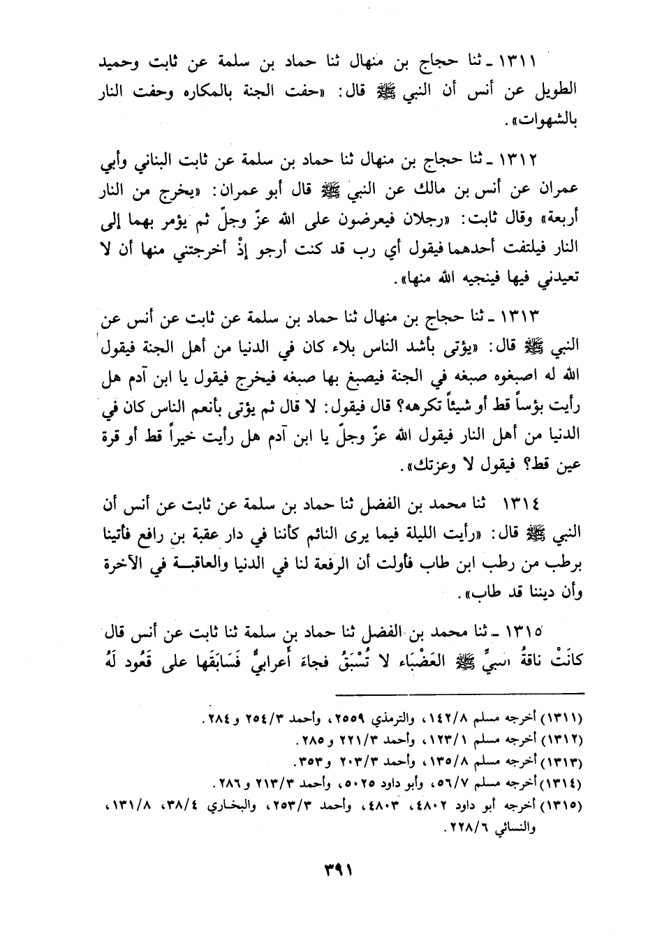 1311 - ثنا حَجَّاجُ بْنُ مِنْهَالٍ، ثَنَا حَمَّادُ بْنُ سَلَمَةَ، عَنْ ثَابِتٍ، وَحُمَيْدٌ الطَّوِيلُ، عَنْ أَنَسٍ: أَنَّ النَّبِيَّ صَلَّى اللهُ عَلَيْهِ وَسَلَّمَ قَالَ: «§حُفَّتِ الْجَنَّةُ بِالْمَكَارِهِ، وَحُفَّتِ النَّارُ بِالشَّهَوَاتِ»
