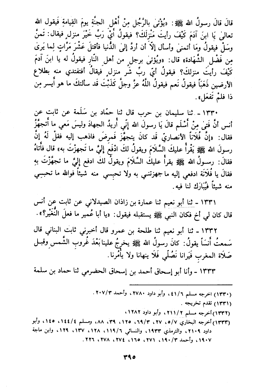 1330 - ثنا سُلَيْمَانُ بْنُ حَرْبٍ قَالَ: ثَنَا حَمَّادُ بْنُ سَلَمَةَ، عَنْ ثَابِتٍ، عَنْ أَنَسٍ، أَنَّ فَتًى مِنْ أَسْلَمَ قَالَ: يَا رَسُولَ اللَّهِ، إِنِّي §أُرِيدُ الْجِهَادَ وَلَيْسَ مَعِي مَا أَتَجَهَّزُ بِهِ؟ فَقَالَ: " إِنَّ فُلَانَا الْأَنْصَارِيَّ قَدْ كَانَ يَتَجَهَّزُ، فَمَرِضَ فَاذْهَبْ إِلَيْهِ، فَقُلْ لَهُ: إِنَّ رَسُولَ اللَّهِ صَلَّى اللهُ عَلَيْهِ وَسَلَّمَ، يَقْرَأُ عَلَيْكَ السَّلَامَ وَيَقُولُ لَكَ: «ادْفَعْ إِلَيَّ مَا تَجَهَّزْتَ بِهِ» قَالَ فَأَتَاهُ فَقَالَ: رَسُولَ اللَّهِ صَلَّى اللهُ عَلَيْهِ وَسَلَّمَ يَقْرَأُ عَلَيْكَ السَّلَامَ وَيَقُولُ لَكَ: «ادْفَعْ إِلَيَّ مَا تَجَهَّزْتَ بِهِ» فَقَالَ: يَا فُلَانَةُ، ادْفَعِي إِلَيْهِ مَا جَهَّزْتِنِي بِهِ وَلَا تَحْبِسِي مِنْهُ شَيْئًا فَوَاللهِ مَا تَحْبِسِي مِنْهُ شَيْئًا، فَيُبَارَك لَنَا فِيهِ
