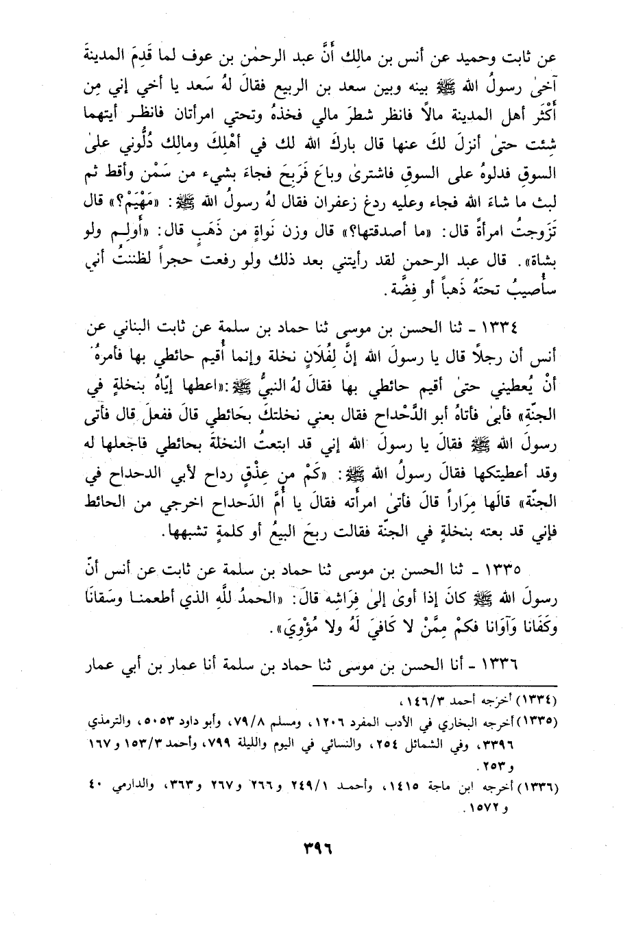1336 - أَنَا الْحَسَنُ بْنُ مُوسَى، ثَنَا حَمَّادُ بْنُ سَلَمَةَ، أنا عَمَّارُ بْنُ أَبِي عَمَّارٍ، عَنْ عَبَّاسٍ، وَثَابِتٌ الْبُنَانِيُّ، عَنْ أَنَسٍ: أَنَّ النَّبِيَّ صَلَّى اللهُ عَلَيْهِ وَسَلَّمَ كَانَ يَخْطُبُ إِلَى جِذْعِ نَخْلَةٍ، فَلَمَّا اتَّخَذَ الْمِنْبَرَ تَحَوَّلَ إِلَى الْمِنْبَرِ، فَحَنَّ الْجِذْعُ حَتَّى أَتَاهُ رَسُولُ اللَّهِ صَلَّى اللهُ عَلَيْهِ وَسَلَّمَ وَاحْتَضَنَهُ فَسَكَنَ، فَقَالَ رَسُولُ اللَّهِ صَلَّى اللهُ عَلَيْهِ وَسَلَّمَ: «§لَوْ لَمْ أَحْتَضَنْهُ لَحَنَّ إِلَى يَوْمِ الْقِيَامَةِ»
