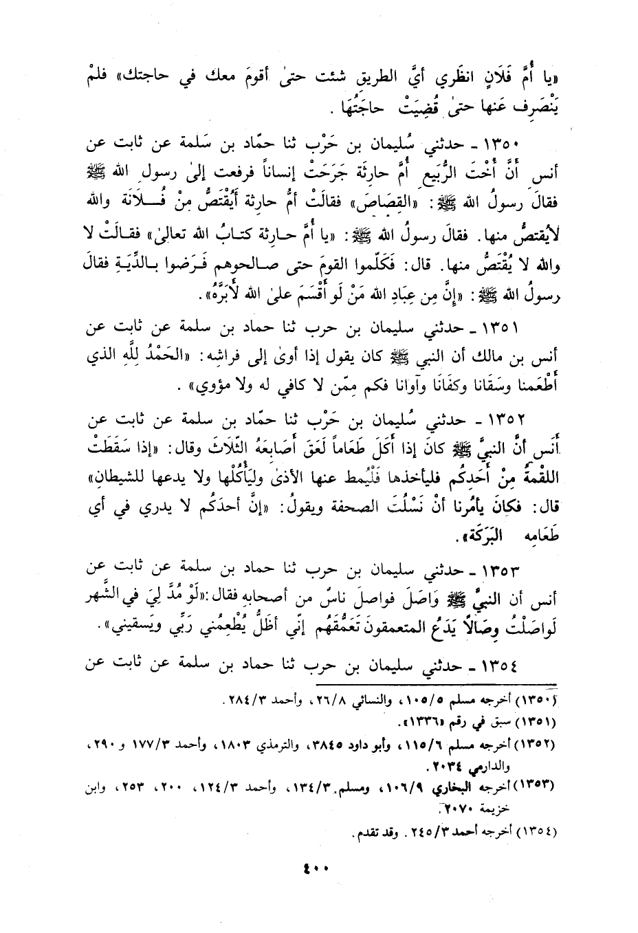 1350 - حَدَّثَنِي سُلَيْمَانُ بْنُ حَرْبٍ، ثَنَا حَمَّادُ بْنُ سَلَمَةَ، عَنْ ثَابِتٍ، عَنْ أَنَسٍ، أَنَّ أُخْتَ الرَّبِيعِ أُمَّ حَارِثَةَ، جَرَحَتْ إِنْسَانًا فَرُفِعَتْ إِلَى رَسُولِ اللَّهِ صَلَّى اللهُ عَلَيْهِ وَسَلَّمَ، فَقَالَ رَسُولُ اللَّهِ صَلَّى اللهُ عَلَيْهِ وَسَلَّمَ: «الْقِصَاصُ» ، فَقَالَتْ: أُمُّ حَارِثَةَ: أَيُقْتَصُّ مِنْ فُلَانَةَ وَاللهِ لَا يُقْتَصُّ مِنْهَا. فَقَالَ رَسُولُ اللَّهِ صَلَّى اللهُ عَلَيْهِ وَسَلَّمَ: «يَا أُمَّ حَارِثَةَ، كِتَابُ اللَّهِ تَعَالَى» ، فَقَالَتْ: لَا وَاللهِ لَا يُقْتَصُّ مِنْهَا قَالَ: فَكَلَّمُوا الْقَوْمَ حَتَّى صَالَحُوهُمْ فَرَضُوا بِالدِّيَةِ فَقَالَ رَسُولُ اللَّهِ صَلَّى اللهُ عَلَيْهِ وَسَلَّمَ: «إِنَّ §مِنْ عِبَادِ اللَّهِ مَنْ لَوْ أَقْسَمَ عَلَى اللَّهِ لَأَبَرَّهُ»
