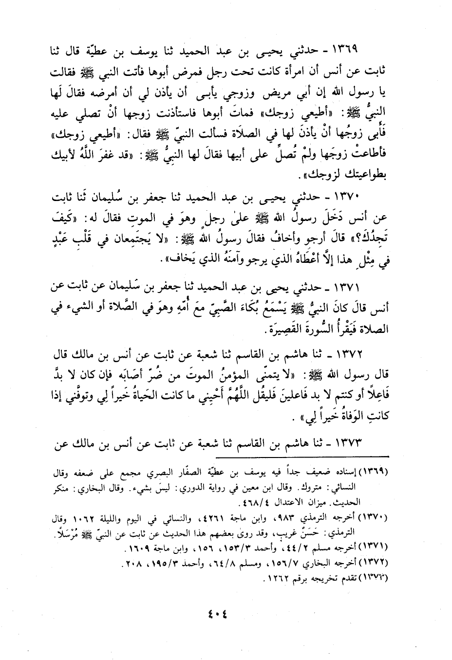 1369 - حَدَّثَنِي يَحْيَى بْنُ عَبْدِ الْحَمِيدِ، ثَنَا يُوسُفُ بْنُ عَطِيَّةَ قَالَ: ثَنَا ثَابِتٌ، عَنْ أَنَسٍ: أَنَّ امْرَأَةً، كَانَتْ تَحْتَ رَجُلٍ فَمَرِضَ أَبُوهَا فَأَتَتِ النَّبِيَّ صَلَّى اللهُ عَلَيْهِ وَسَلَّمَ، فَقَالَتْ: يَا رَسُولَ اللَّهِ، إِنَّ أَبِي مَرِيضٌ، وَزَوْجِي يَأْبَى أَنْ يَأْذَنَ لِي أَنْ أُمَرِّضَهُ، فَقَالَ لَهَا النَّبِيُّ صَلَّى اللهُ عَلَيْهِ وَسَلَّمَ: «§أَطِيعِي زَوْجَكَ» فَمَاتَ أَبُوهَا فَاسْتَأْذَنَتْ زَوْجَهَا أَنْ تُصَلِّيَ عَلَيْهِ فَأَبَى زَوْجُهَا أَنْ يَأْذَنَ لَهَا فِي الصَّلَاةِ فَسَأَلَتِ النَّبِيَّ صَلَّى اللهُ عَلَيْهِ وَسَلَّمَ فَقَالَ لَهَا: «أَطِيعِي زَوْجَكِ» فَأَطَاعَتْ زَوْجَهَا وَلَمْ تُصَلِّ عَلَى أَبِيهَا، فَقَالَ لَهَا النَّبِيُّ صَلَّى اللهُ عَلَيْهِ وَسَلَّمَ: «قَدْ غَفَرَ اللَّهُ لِأَبِيكَ بِطَوَاعِيَتِكَ لِزَوجِكَ»