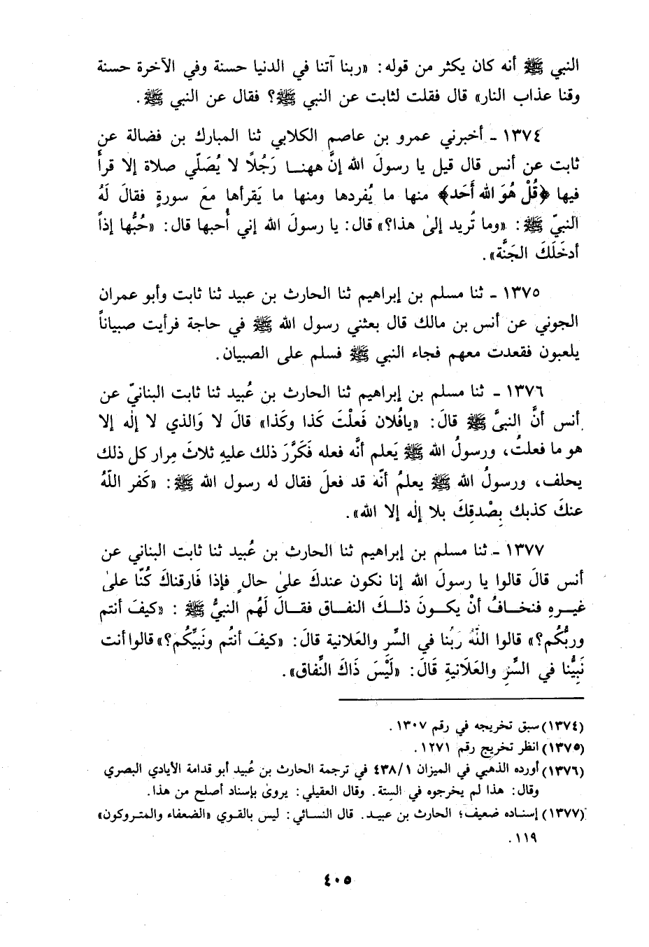 1377 - ثنا مُسْلِمُ بْنُ إِبْرَاهِيمَ، ثَنَا الْحَارِثُ بْنُ عُبَيْدٍ، ثَنَا ثَابِتٌ الْبُنَانِيُّ، عَنْ أَنَسٍ قَالَ: قَالُوا: يَا رَسُولَ اللَّهِ، إِنَّا نَكُونُ عِنْدَكَ عَلَى حَالٍ فَإِذَا فَارَقْنَاكَ كُنَّا عَلَى غَيْرِهِ، فَنَخَافُ أَنْ يَكُونَ ذَلِكَ النِّفَاقَ، فَقَالَ لَهُمُ النَّبِيُّ صَلَّى اللهُ عَلَيْهِ وَسَلَّمَ: «§كَيْفَ أَنْتُمْ وَرَبُّكُمْ؟» قَالُوا: اللَّهُ رَبُّنَا فِي السِّرِّ وَالْعَلَانِيَةِ قَالَ: «كَيْفَ أَنْتُمْ وَنَبِيُّكُمْ؟» قَالُوا: أَنْتَ نَبِيُّنَا فِي السِّرِّ وَالْعَلَانِيَةِ قَالَ: «لَيْسَ ذَاكَ النِّفَاقَ»