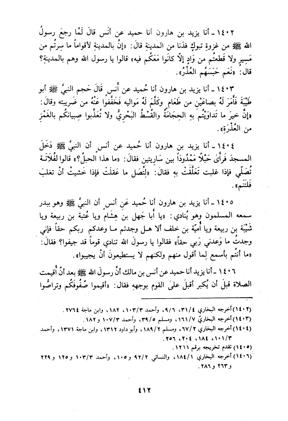 1405 - أنا يَزِيدُ بْنُ هَارُونَ، أنا حُمَيْدٌ، عَنْ أَنَسٍ، أَنَّ النَّبِيَّ صَلَّى اللهُ عَلَيْهِ وَسَلَّمَ وَهُوَ بِبَدْرٍ سَمِعَهُ الْمُسْلِمُونَ وَهُوَ يُنَادِي: «§يَا أَبَا جَهُلِ بْنَ هِشَامٍ، وَيَا عُتْبَةَ بْنَ رَبِيعَةَ، وَيَا شَيْبَةَ بْنَ رَبِيعَةَ، وَيَا أُمَيَّةَ بْنَ خَلَفٍ أَلَا هَلْ وَجَدْتُمْ مَا وَعَدَكُمْ رَبُّكُمْ حَقًّا، فَإِنِّي وَجَدْتُ مَا وَعَدَنِي رَبِّي حَقًّا» ، فَقَالُوا: يَا رَسُولَ اللَّهِ، تُنَادِي قَوْمًا قَدْ جُيِّفُوا، فَقَالَ: «مَا أَنْتُمْ بِأَسْمَعَ لِمَا أَقُولُ مِنْهُمْ وَلَكِنَّهُمْ لَا يَسْتَطِيعُونَ أَنْ يُجِيبُوا»