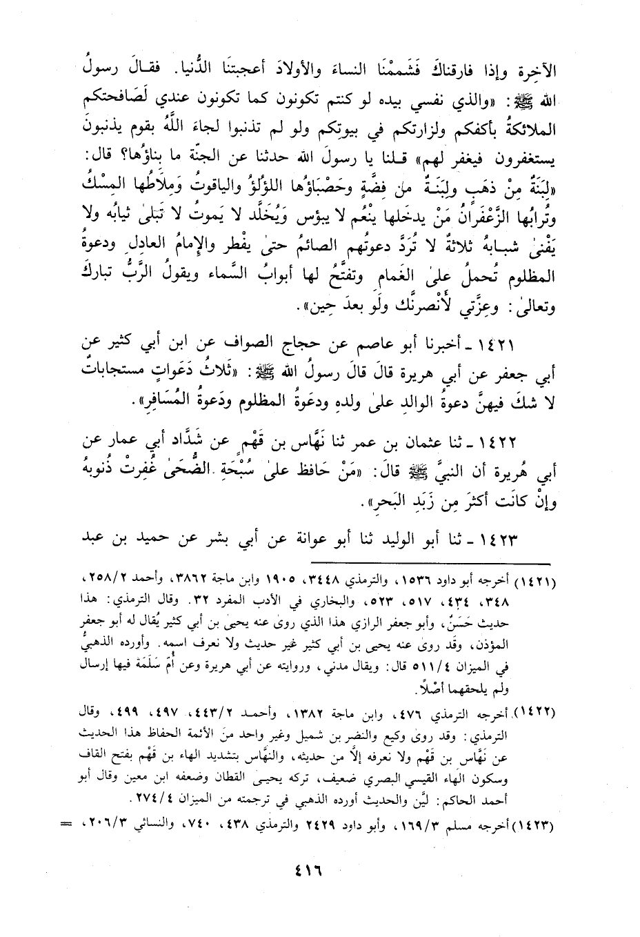 1421 - أَخْبَرَنَا أَبُو عَاصِمٍ، عَنْ حَجَّاجٍ الصَّوَّافِ، عَنِ ابْنِ أَبِي كَثِيرٍ، عَنْ أَبِي جَعْفَرٍ، عَنْ أَبِي هُرَيْرَةَ قَالَ: قَالَ رَسُولُ اللَّهِ صَلَّى اللهُ عَلَيْهِ وَسَلَّمَ: " §ثَلَاثُ دَعَوَاتٍ مُسْتجَابَاتٌ لَا شَكَّ فِيهِنَّ: دَعُوَةُ الْوَالِدِ عَلَى وَلَدِهِ، وَدَعُوَةُ الْمَظْلُومِ، وَدَعُوَةُ الْمُسَافِرِ "