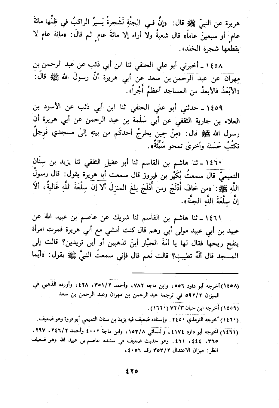 1460 - ثنا هَاشِمُ بْنُ الْقَاسِمِ، ثَنَا أَبُو عَقِيلٍ الثَّقَفِيُّ، ثَنَا يَزِيدُ بْنُ سِنَانٍ التَّمِيمِيُّ قَالَ: سَمِعْتُ بُكَيْرَ بْنَ فَيْرُوزَ قَالَ: سَمِعْتُ أَبَا هُرَيْرَةَ، يَقُولُ: قَالَ رَسُولُ اللَّهِ صَلَّى اللهُ عَلَيْهِ وَسَلَّمَ: «§مَنْ خَافَ أَدْلَجَ، وَمَنْ أَدْلَجَ بَلَغَ الْمَنْزِلَ أَلَا إِنَّ سِلْعَةَ اللَّهِ غَالِيَةٌ أَلَا إِنَّ سِلْعَةَ اللَّهِ الْجَنَّةُ»