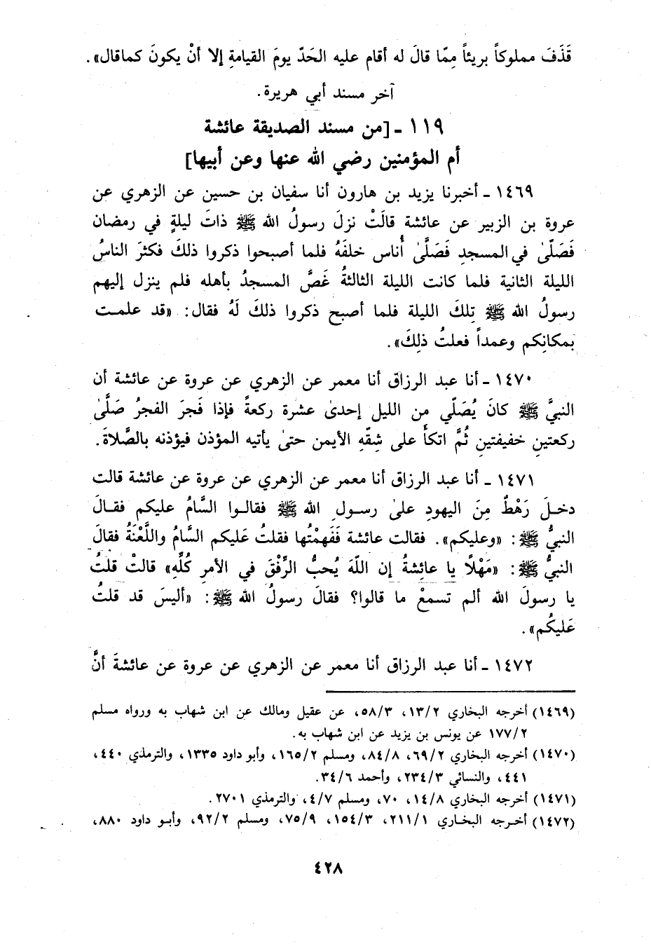 1471 - أنا عَبْدُ الرَّزَّاقِ، أنا مَعْمَرٌ، عَنِ الزُّهْرِيِّ، عَنْ عُرْوَةَ، عَنْ عَائِشَةَ، قَالَتْ: دَخَلَ رَهْطٌ مِنَ الْيَهُودِ عَلَى رَسُولِ اللَّهِ صَلَّى اللهُ عَلَيْهِ وَسَلَّمَ، فَقَالُوا: السَّامُ عَلَيْكُمْ، فَقَالَ النَّبِيُّ صَلَّى اللهُ عَلَيْهِ وَسَلَّمَ: «وَعَلَيْكُمْ» ، فَقَالَتْ عَائِشَةُ: فَفَهِمْتُهَا فَقُلْتُ: عَلَيْكُمُ السَّامُ وَاللعْنَةُ، فَقَالَ النَّبِيُّ صَلَّى اللهُ عَلَيْهِ وَسَلَّمَ: «§مَهْلًا يَا عَائِشَةُ إِنَّ اللَّهَ يُحِبُّ الرِّفْقَ فِي الْأَمْرِ كُلِّهِ» قَالَتْ: قُلْتُ: يَا رَسُولَ اللَّهِ، أَلَمْ تَسْمَعْ مَا قَالُوا؟ فَقَالَ رَسُولُ اللَّهِ صَلَّى اللهُ عَلَيْهِ وَسَلَّمَ: «أَلَيْسَ قَدْ قُلْتُ عَلَيْكُمْ»