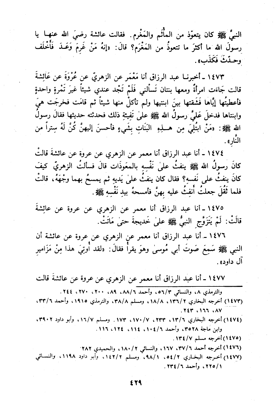 1473 - أَخْبَرَنَا عَبْدُ الرَّزَّاقِ، أنا مَعْمَرٌ، عَنِ الزُّهْرِيِّ، عَنْ عُرْوَةَ، عَنْ عَائِشَةَ، قَالَتْ: جَاءَتِ امْرَأَةٌ وَمَعَهَا بِنْتَانِ تَسْأَلُنِي، فَلَمْ تَجِدْ عِنْدِي شَيْئًا غَيْرَ تَمْرَةٍ وَاحِدَةٍ، فَأَعْطَيْتُهَا إِيَّاهَا، فَشَقَّتَهَا بَيْنَ ابْنَتَيْهَا وَلَمْ تَأْكُلْ مِنْهَا شَيْئًا، ثُمَّ قَامَتْ فَخَرَجَتْ هِيَ وَابْنَتَاهَا، فَدَخَلَ عَلَيَّ رَسُولُ اللَّهِ صَلَّى اللهُ عَلَيْهِ وَسَلَّمَ، عَلَى تَفِيئَةِ ذَلِكَ، فَحَدَّثْتُهُ حَدِيثَهَا، فَقَالَ رَسُولُ اللَّهِ صَلَّى اللهُ عَلَيْهِ وَسَلَّمَ: «§مَنِ ابْتُلِيَ مِنْ هَذِهِ الْبَنَاتِ بِشَيْءٍ، - فَأَحْسَنَ إِلَيْهِنَّ كُنَّ لَهُ سِتْرًا مِنَ النَّارِ»