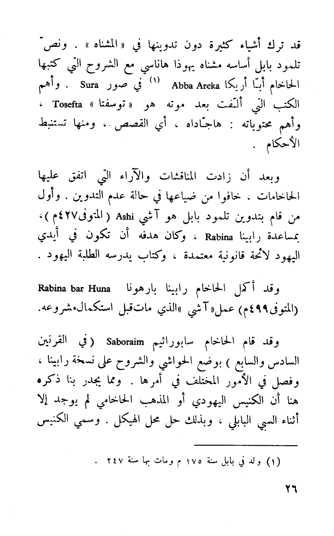 وقد قام الحاخام سابورائيم SABORAIM في القرنين السادس والسابع بوضع الحواشي والشروح على نسخة رابينا، وفصل في الأمور المختلف في أمرها، ومما يجدر بنا ذكره هنا أن الكنيس اليهودي أو المذهب الحاخامي لم يوجد إلّا أثناء السبي البابلي، وبذلك حلّ محل الهيكل، وسمِّي الكنيس