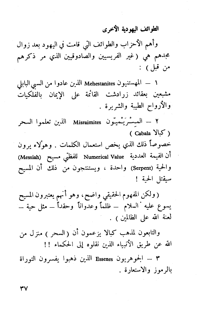 2- المسريميون Misraimites الذين تعلموا السحر ب"كبالا Cabala"، خصوصًا ذلك الذي يخص استعمال الكلمات، وهؤلاء يرون أن القيمة العددية Numerical value للفظتي مسيح "messiah" والحية Serpent واحدة، ويستنتجون من ذلك أن المسيح سيقتل الحية!