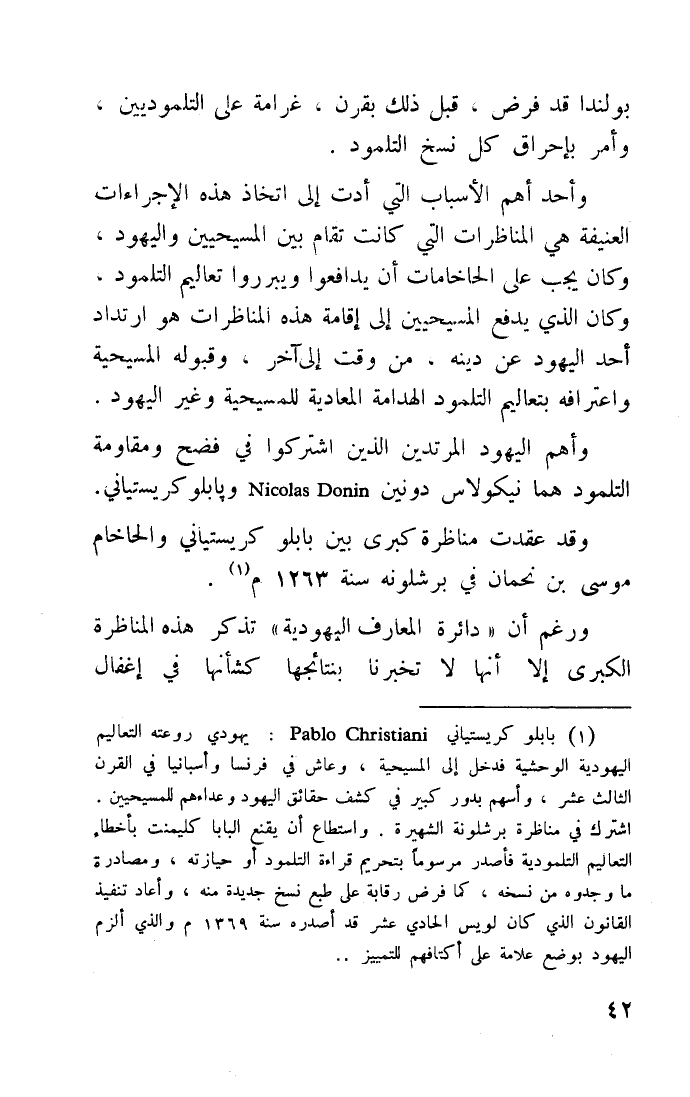 1 بابلو كريستيانيس Pablo Christiani: يهودي روعته التعاليم اليهودية الوحشية فدخل إلى المسيحية، وعاش في فرنسا وأسبانيا في القرن الثالث عشر، وأسهم بدور كبير في كشف حقائق اليهود وعداءهم للمسيحيين. اشترك في مناظرة برشلونة الشهيرة. واستطاع أن يقنع البابا كليمنت بأخطاء التعاليم التلمودية، فأصدر مرسومًا بتحريم قراءة التلمود أو حيازته، ومصادرة ما وجدوه من نسخه، كما فرض رقابة على طبع نسخ جديدة منه، وأعاد تنفيذ القانون الذي كان لويس الحادي عشر قد أصدره سنة 1369م، والذي ألزم اليهود بوضع علامة على أكتافهم للتمييز....