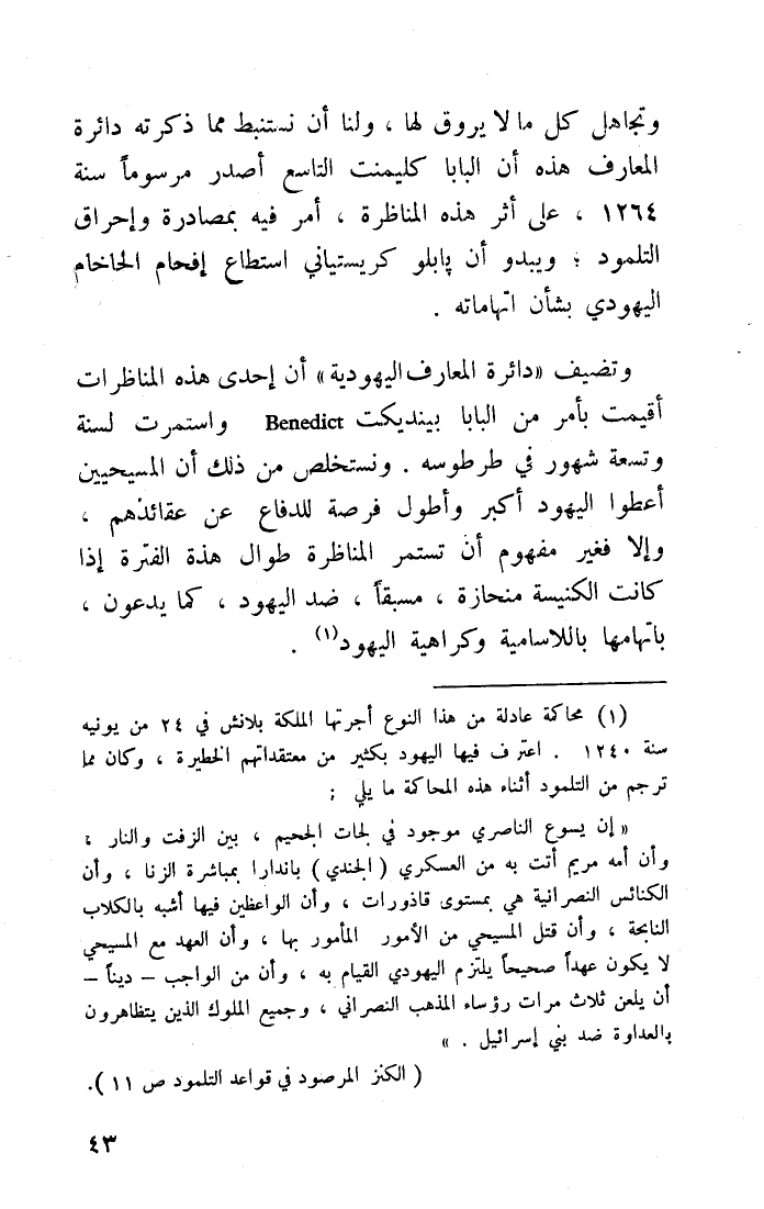 1 محاكمة عادلة من هذا النوع أجرتها الملكة بلانش في 24 من يونيه سنة 1240. اعترف فيها اليهود بكثير من معتقداتهم الخطيرة، وكان مما ترجم من التلمود أثناء هذه المحاكمة مما يلي: