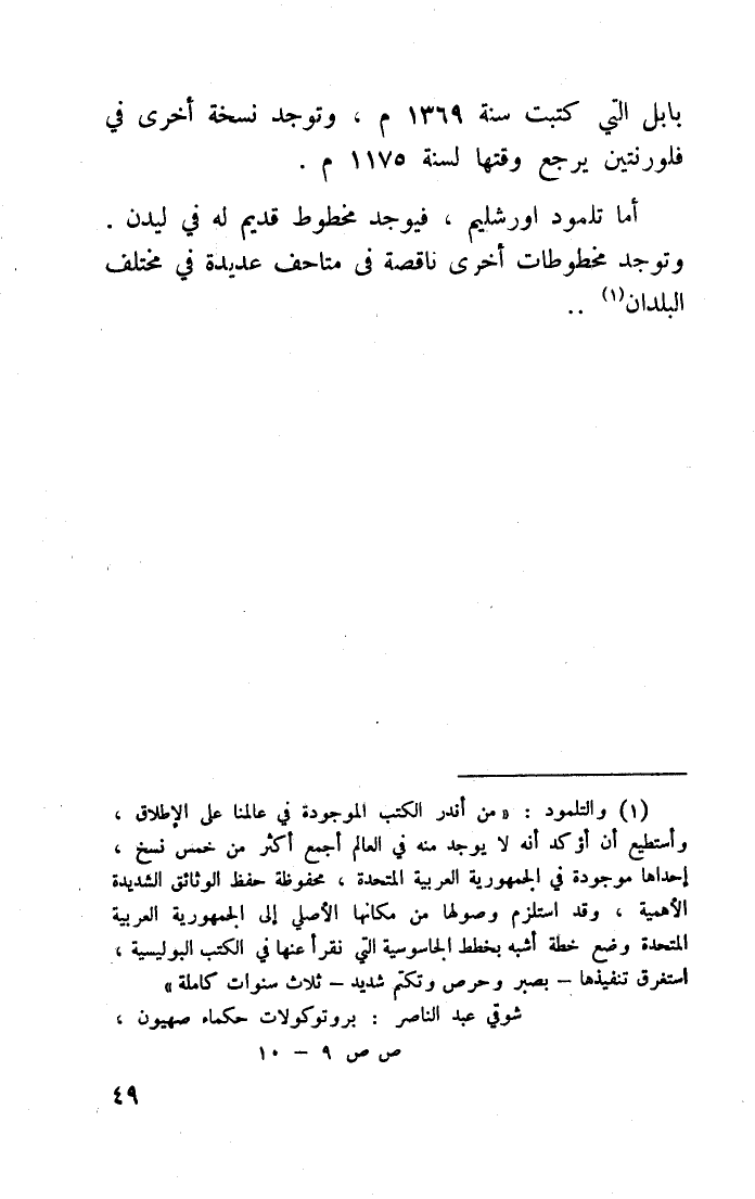 1 والتلمود: "من أندر الكتب الموجودة في عالمنا على الإطلاق، وأستطيع أن أؤكد أنه لا يوجد منه في العالم أجمع أكثر من خمس نسخ، إحداها موجودة في الجمهورية العربية المتحدة، محفوظة حفظ الوثائق الشديدة الأهمية، وقد استلزم وصولها من مكانها الأصلي إلى الجمهورية العربية المتحدة وضع خطة أشبه بخطط الجاسوسية التي نقرأ عنها في الكتب البوليسية، استغرق تنفيذها -بصبر وحرص وتكتم شديد- ثلاث سنوات كاملة".