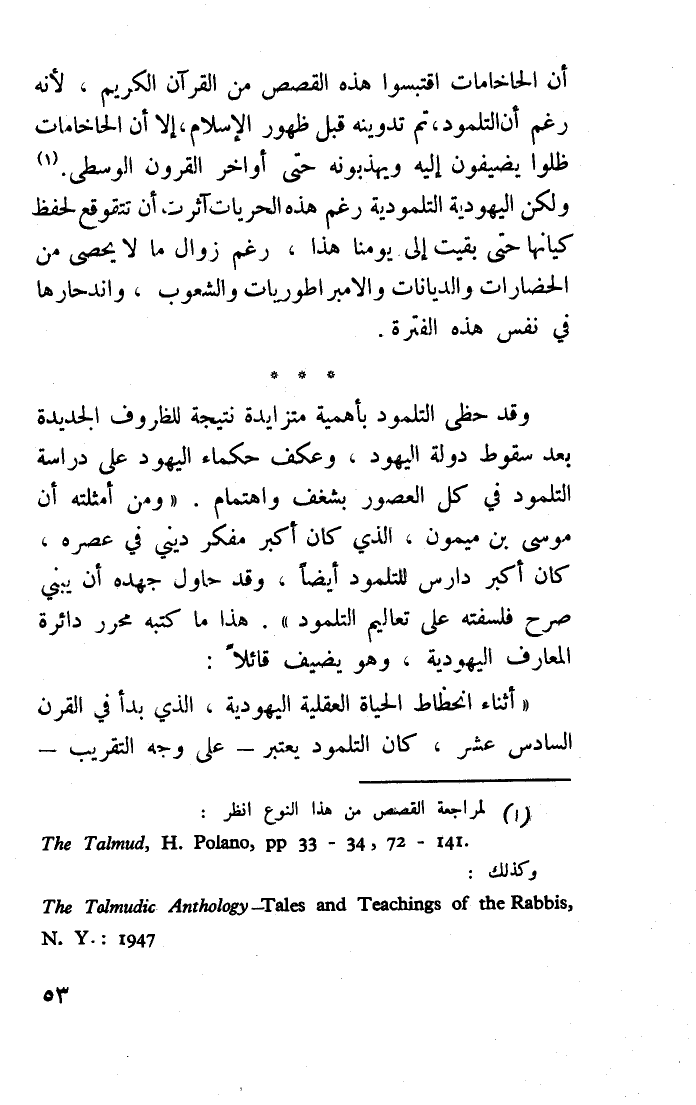 أنَّ الحاخامات اقتبسوا هذه القصص من القرآن الكريم؛ لأنَّه رغم أن التلمود تمَّ تدوينه قبل ظهور الإسلام، إلَّا أن الحاخامات ظلو يضيفون إليه ويهذبونه حتى أواخر القرون الوسطى1، ولكن اليهودية التلمودية رغم هذه الحريات آثرت أن تتقوقع لحفظ كيانها حتى بقيت إلى يومنا هذا، رغم زوال ما لا يحصى من الحضارات والديانات والإمبراطوريات والشعوب، واندحارها في نفس هذه الفترة.