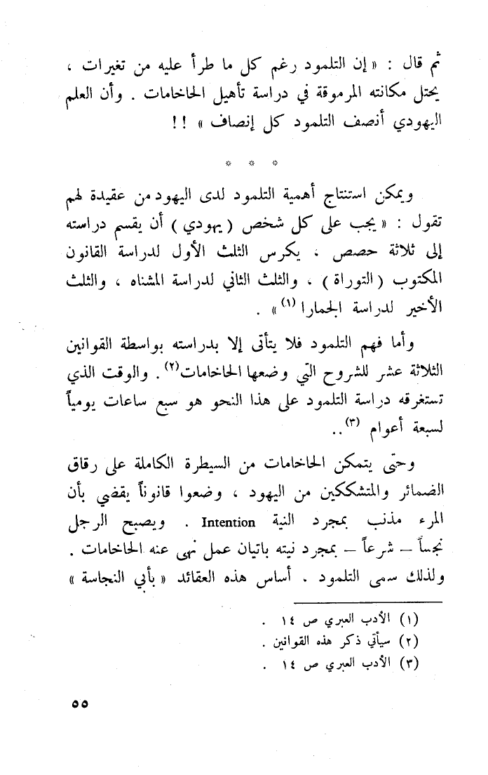 ثم قال: "إن التلمود رغم كل ما طرأ عليه من تغيرات يحتل مكانته المرموقة في دراسة تأهيل الحاخامات، وأن العلم اليهودي أنصف التلمود كل إنصاف".