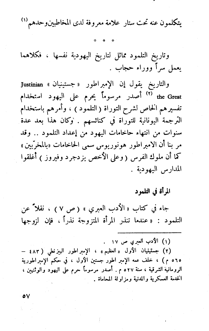 والتاريخ يقول: إن الإمبراطور "جستينيان" Justinian the great 2 أصدر مرسومًا يحرّم على اليهود استخدام تفسيرهم الخاص لشرح التوراة "التلمود"، وأمرهم باستخدام الترجمة اليونانية للتوراة في كنائسهم، وكان هذا بعد عدة سنوات من انتهاء حاخامات اليهود من إعداد التلمود، وقد مرَّ بنا أن الإمبراطور هونوريوس سمّى الحاخامات "بالمخربين" كما أن ملوك الفرس "وعلى الأخص يزدجرد وفيروز" أغلقوا المدارس اليهودية.